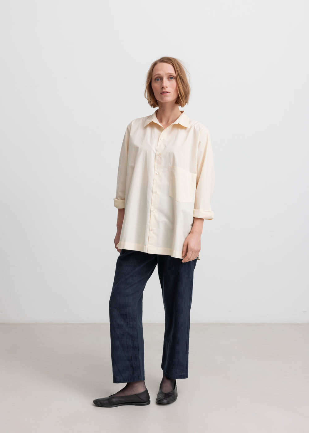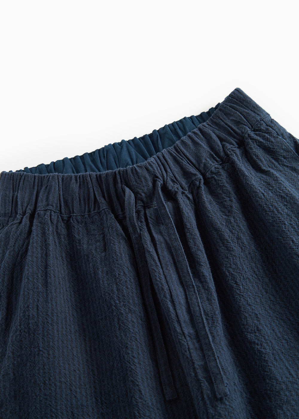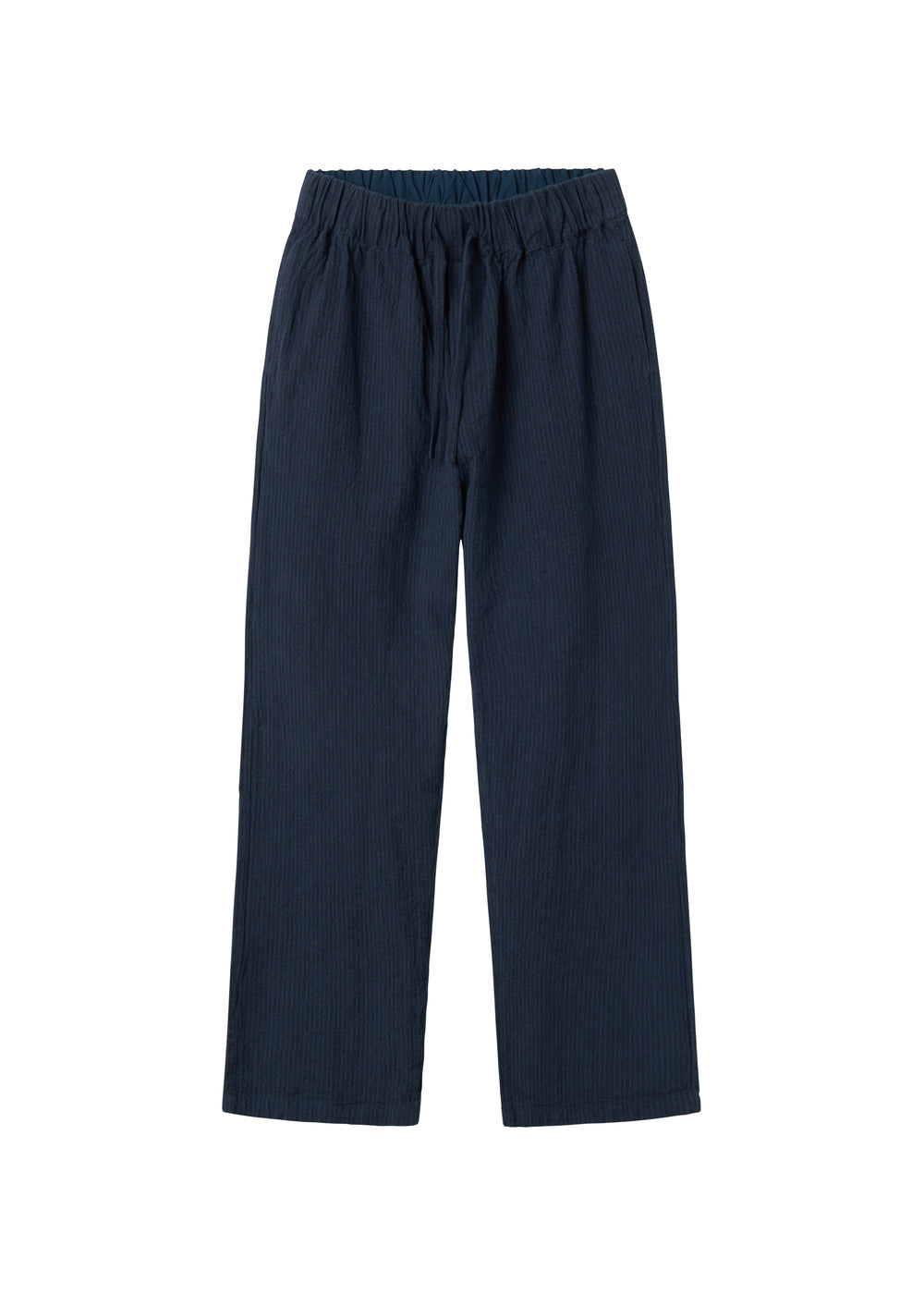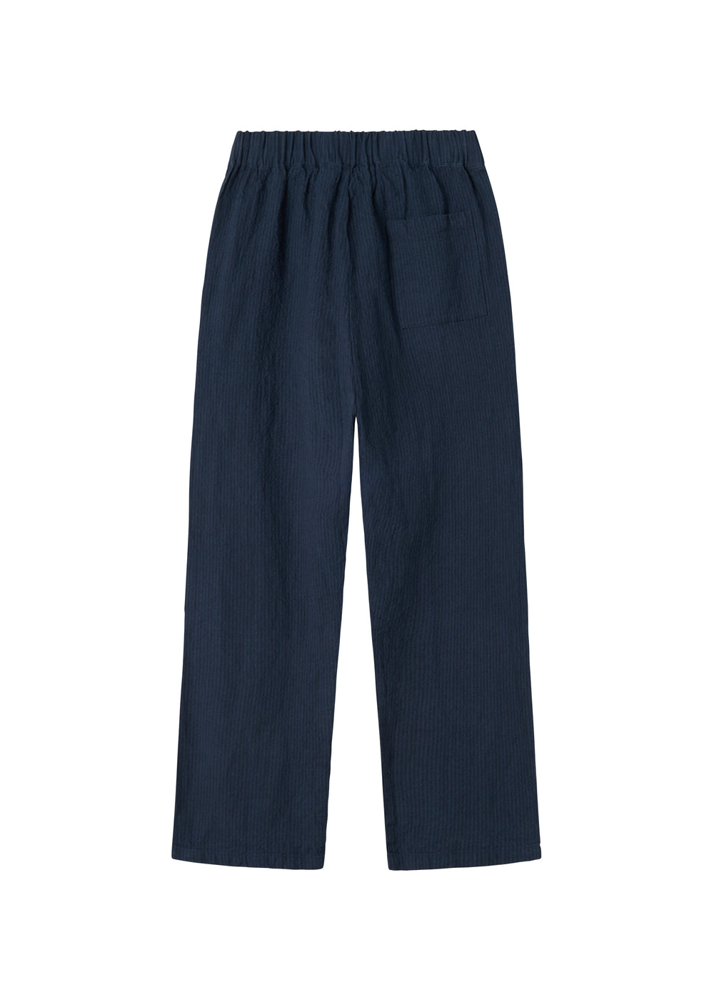 Bukser i stribet chambray denim til kvinder med en løs pasform og med en lomme bagpå samt elastik og bindebånd i taljen.
