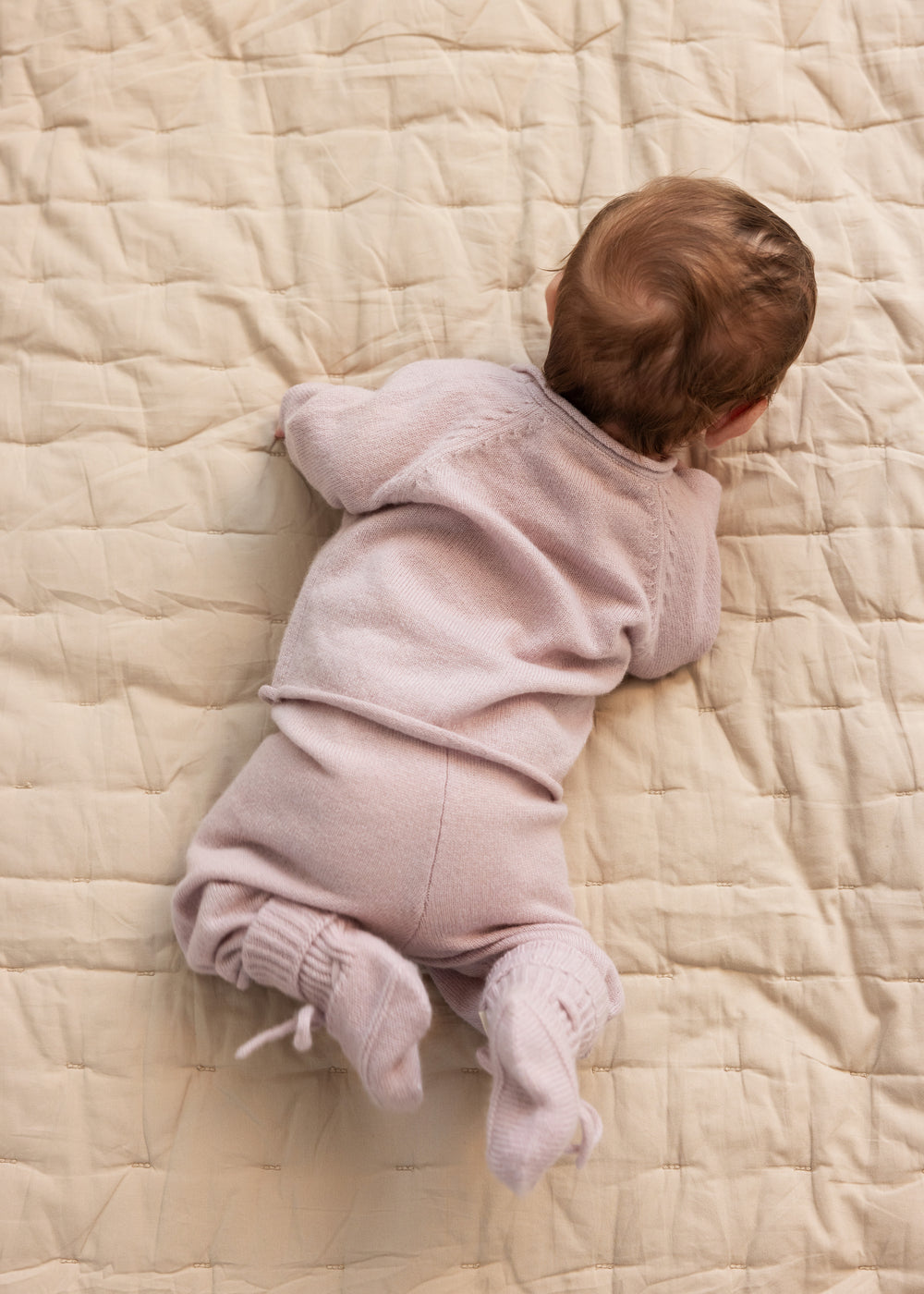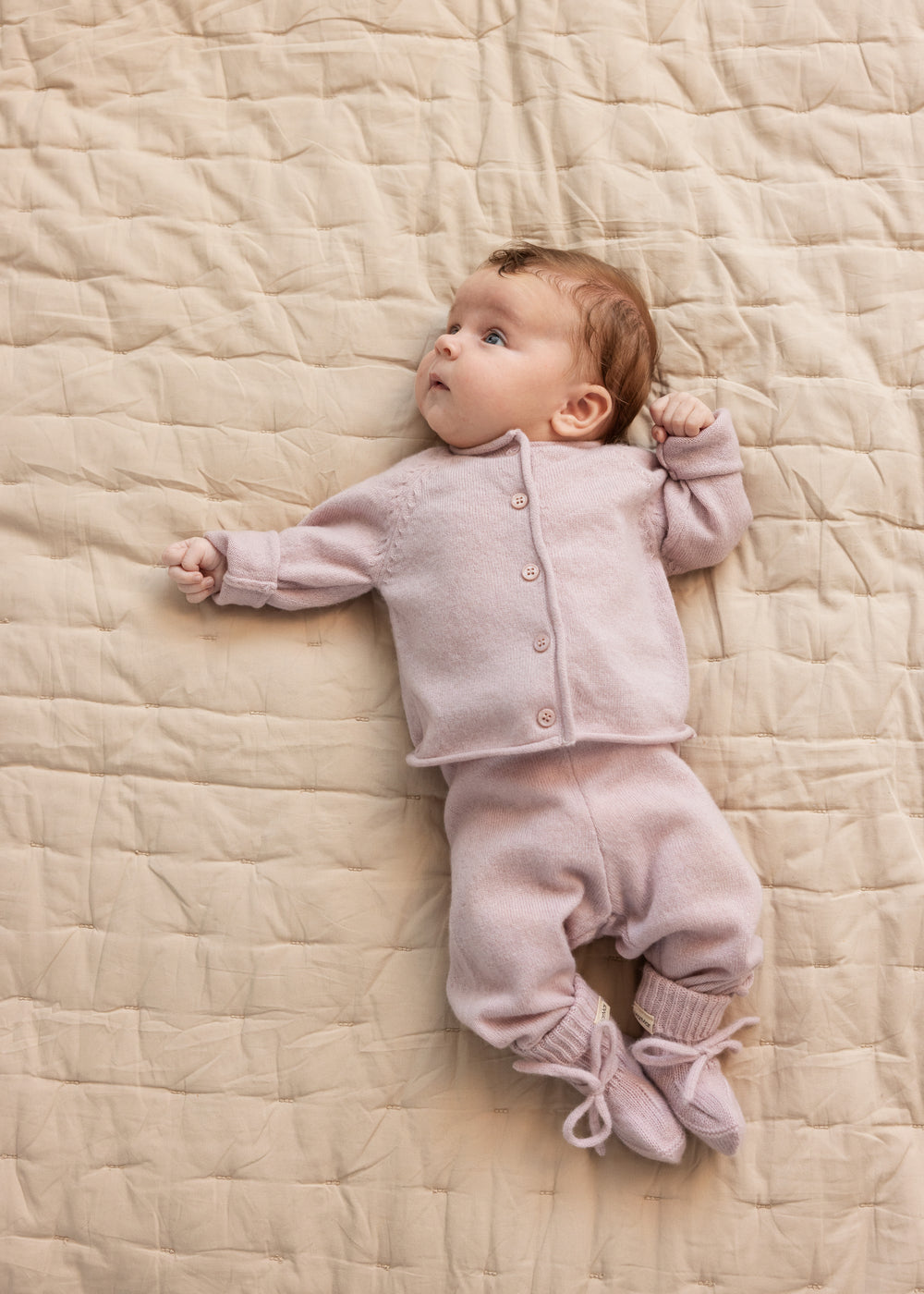 Kashmir bukser til baby med elastik og bindebånd i livet. Kashmir bukserne er ultra bløde, varme og behagelige at have på og helt perfekt til de koldere dage.
