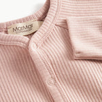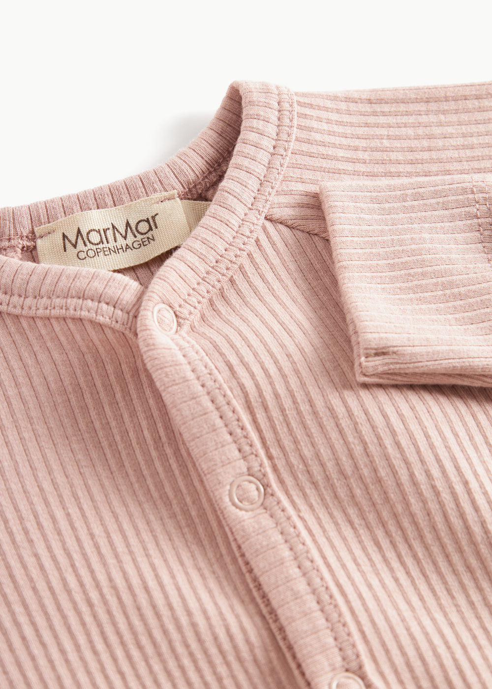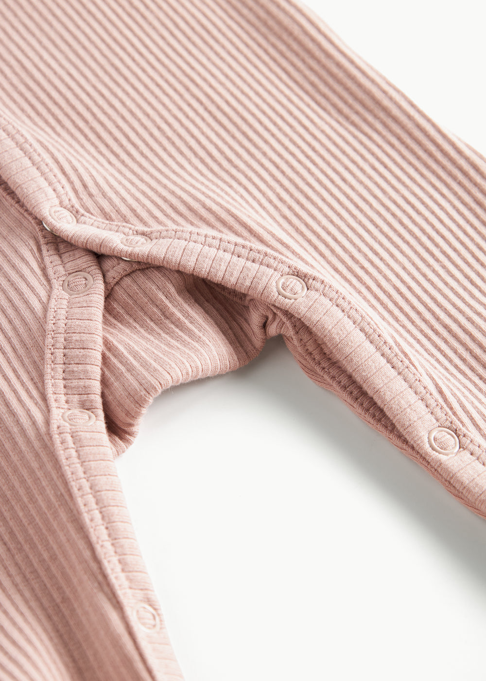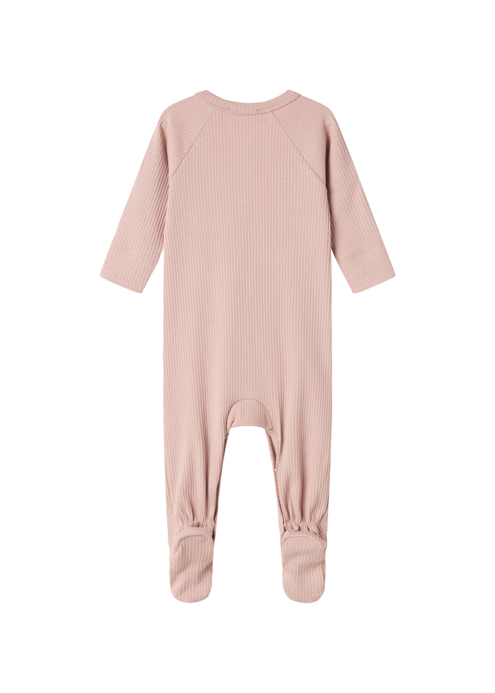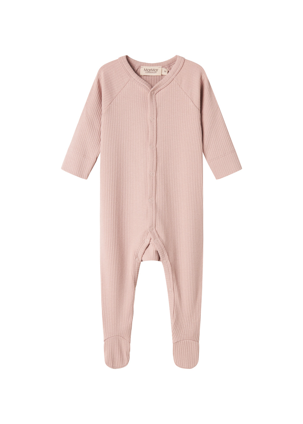 Enkel langærmet heldragt med fødder der kan knappes helt fra hals og ned langs begge ben med trykknapper for nem bleskiftning. Heldragten er både blød, holder form og farve og har elastan i sig som gør den strækbar og behagelig at have på.