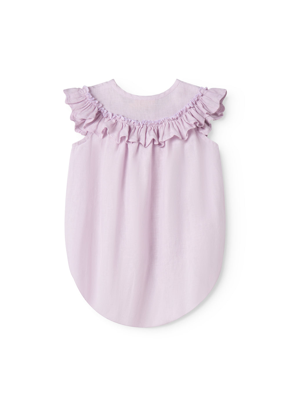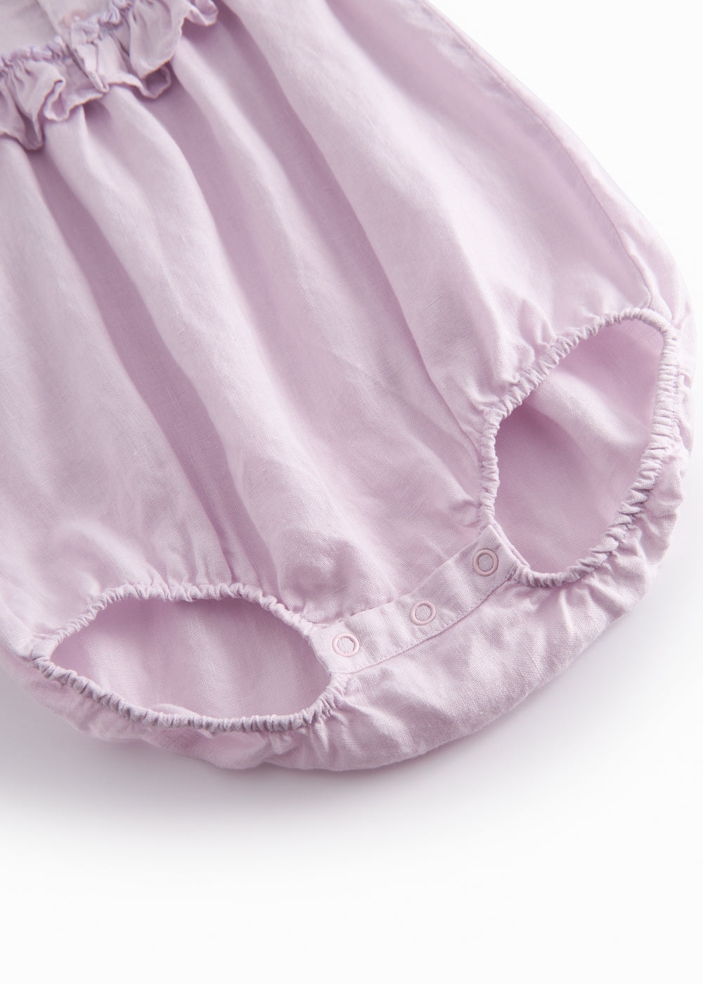 Heldragt til baby med korte ærmer og flæsedetaljer, i luftig og behagelig hør kvalitet. Heldragten bliver lukket med knapper foran og har trykknapper mellem benene for nem bleskiftning.