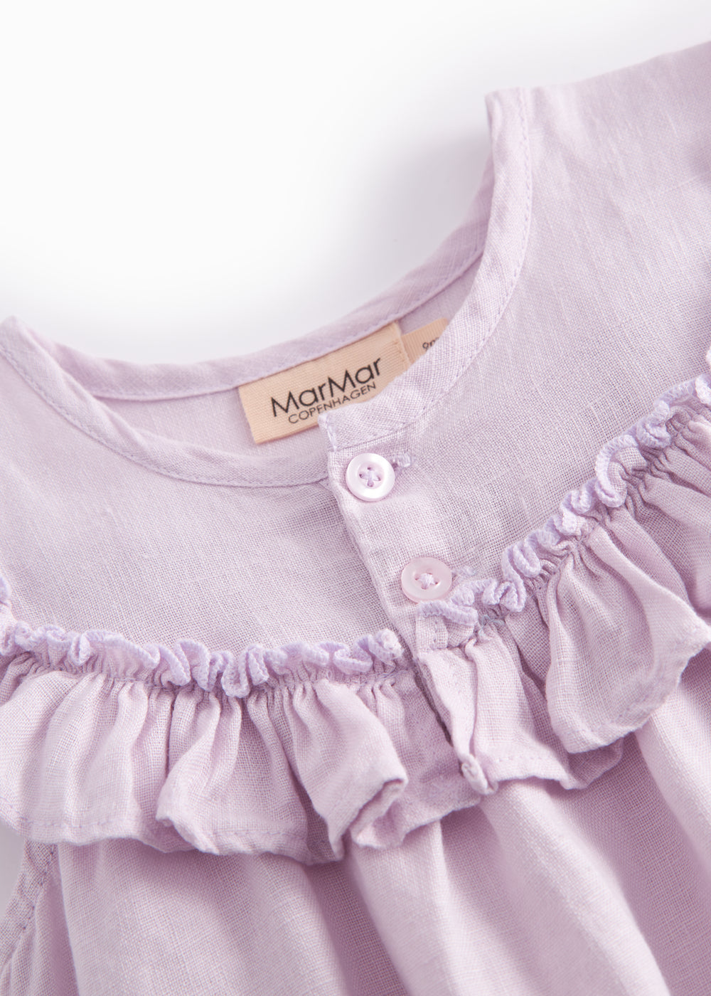 Lys lilla heldragt til baby med korte ærmer og flæsedetaljer