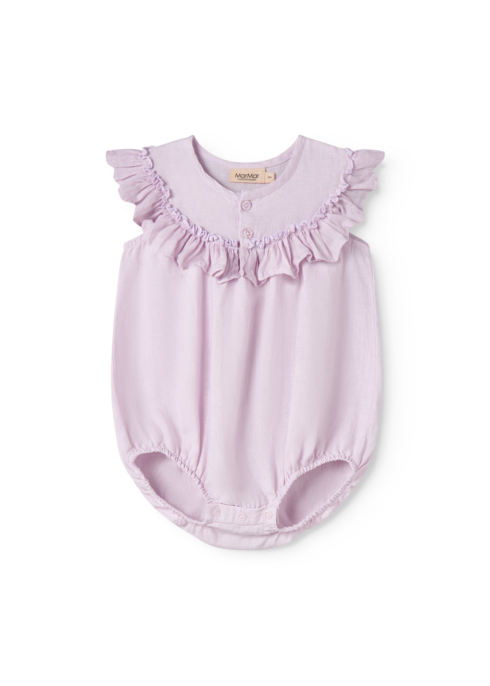 Baby iført lys lilla heldragt til baby med korte ærmer og flæsedetaljer