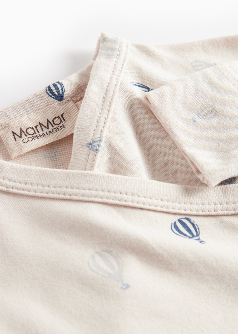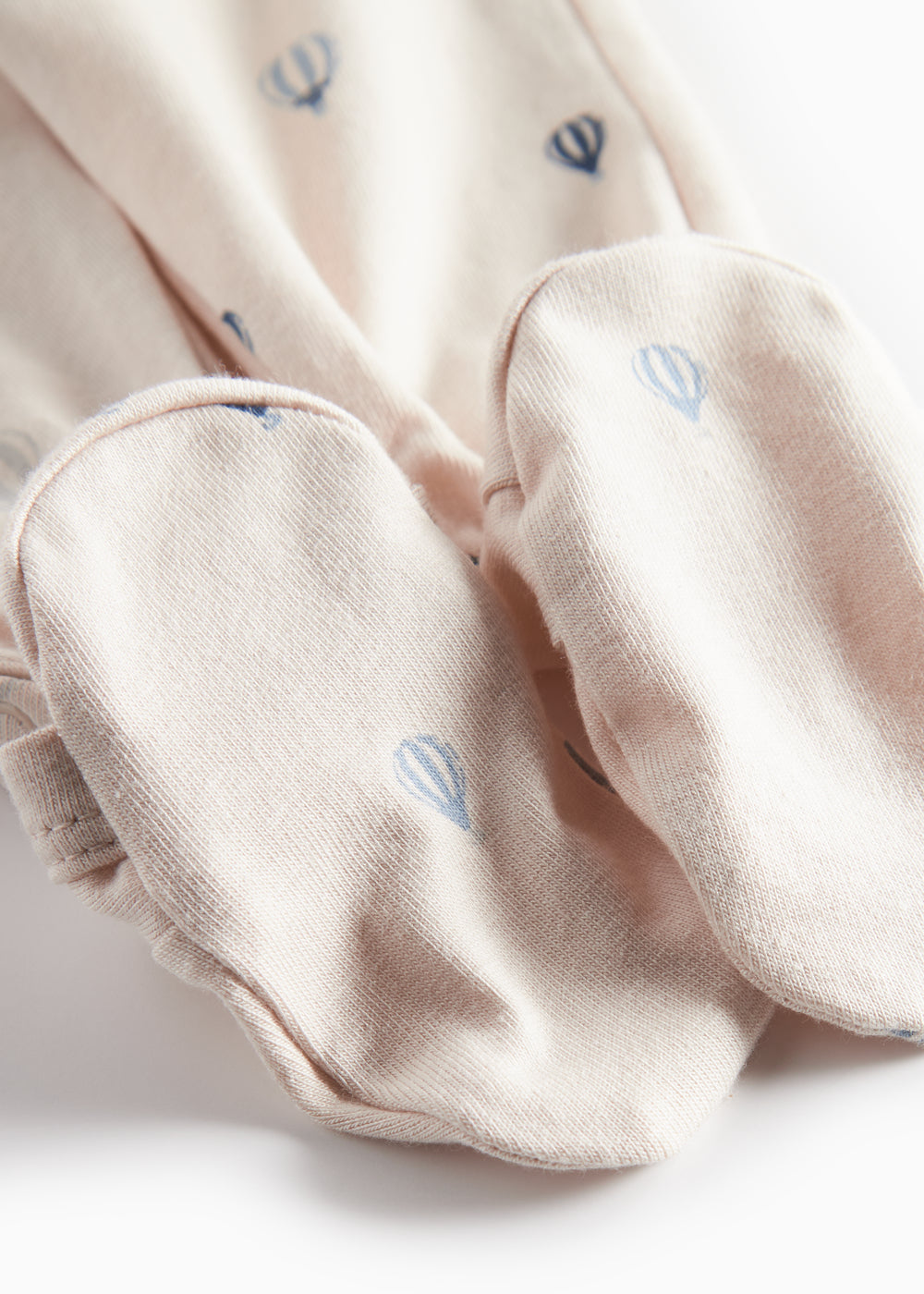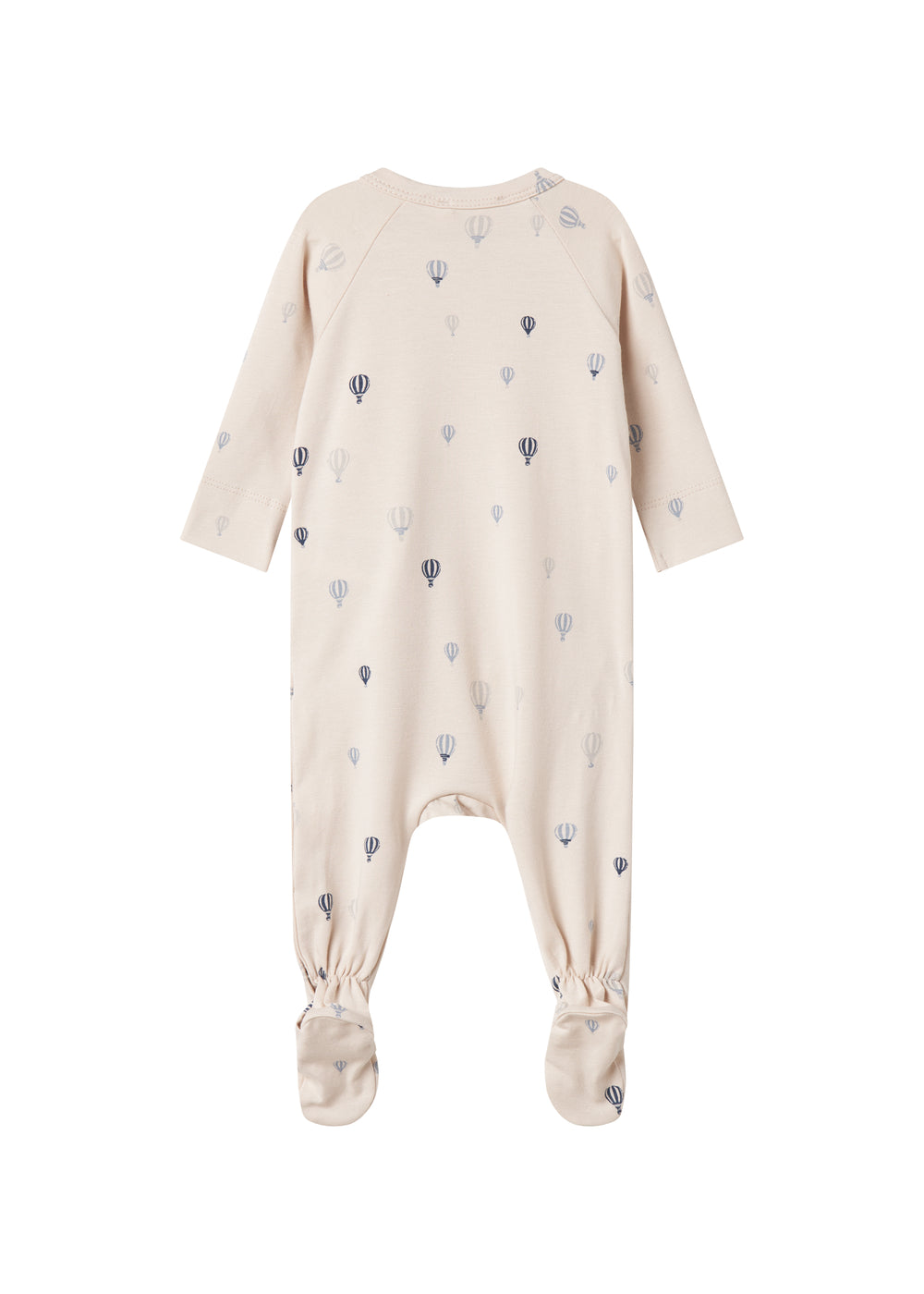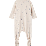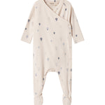 Langærmet heldragt med fødder til nyfødte. Heldragten har slå-om-lukning og lukkes med trykknapper fra halsen og ned langs det ene ben. Heldragten har et fint print og er både blød, strækbar og behagelig at have på.