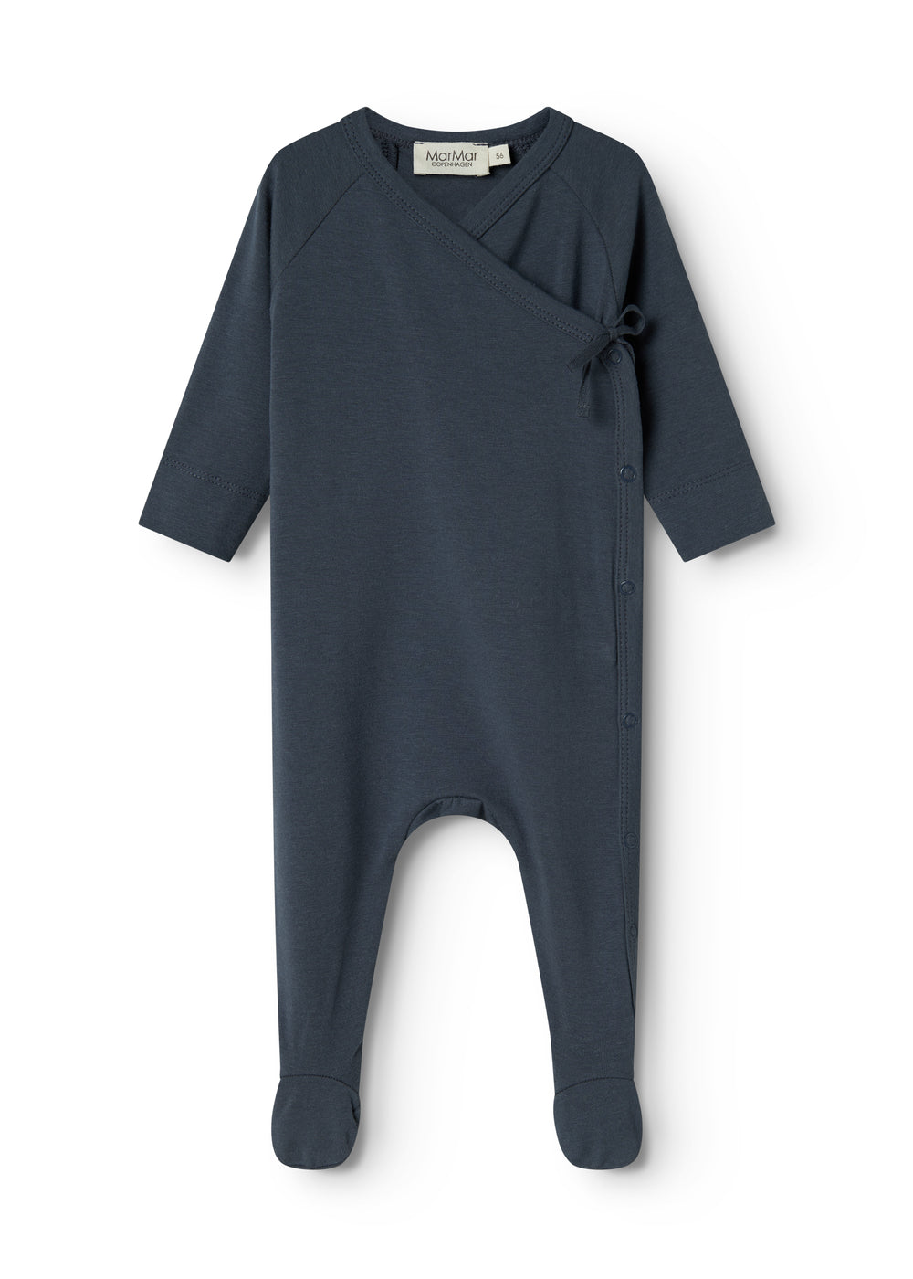Heldragten har slå-om-lukning og lukkes med trykknapper og bindebånd fra halsen og ned langs det ene ben.