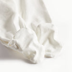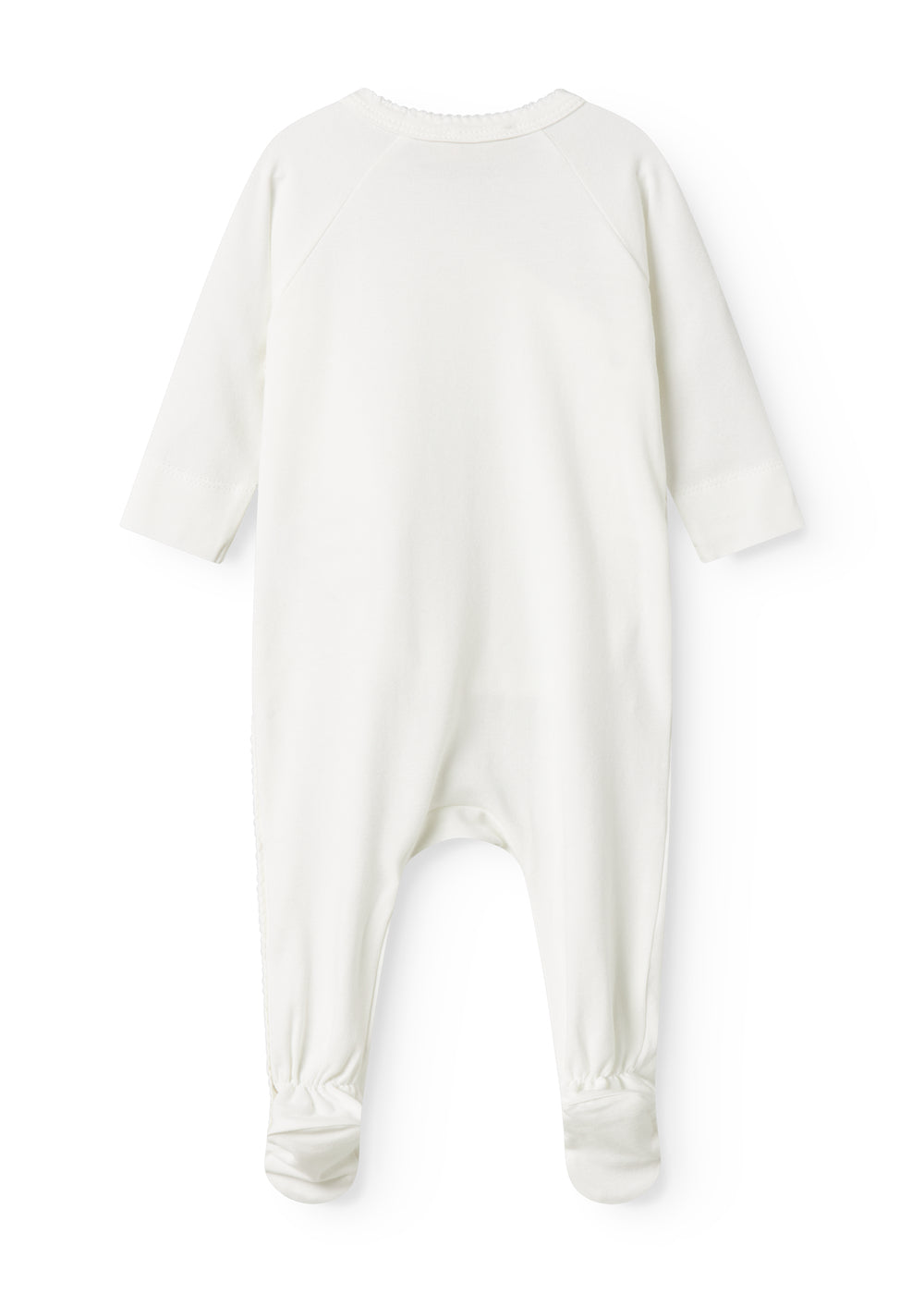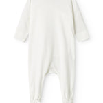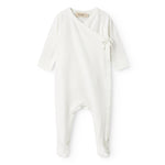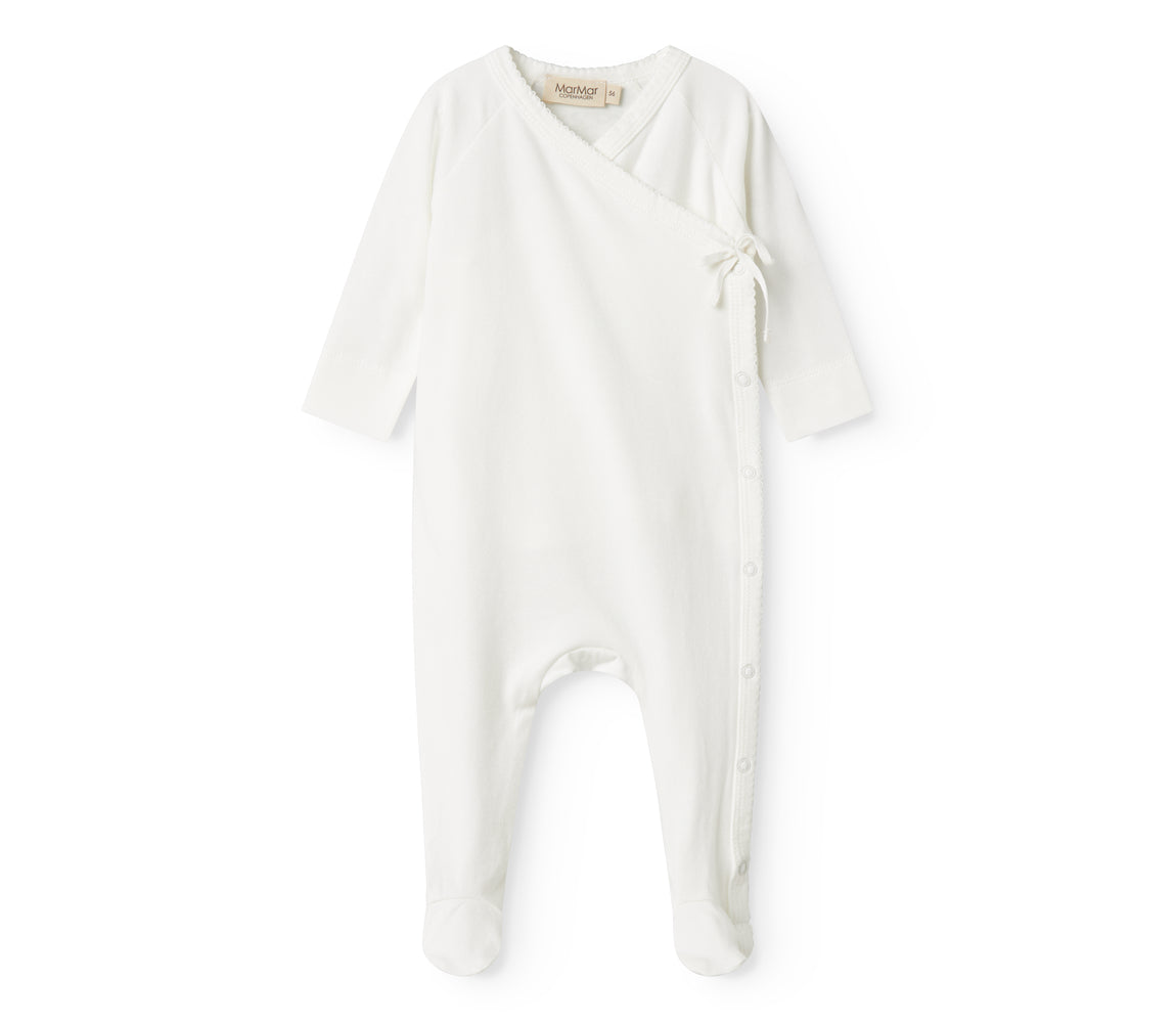 Heldragten har slå-om-lukning og lukkes med trykknapper og bindebånd fra halsen og ned langs det ene ben.