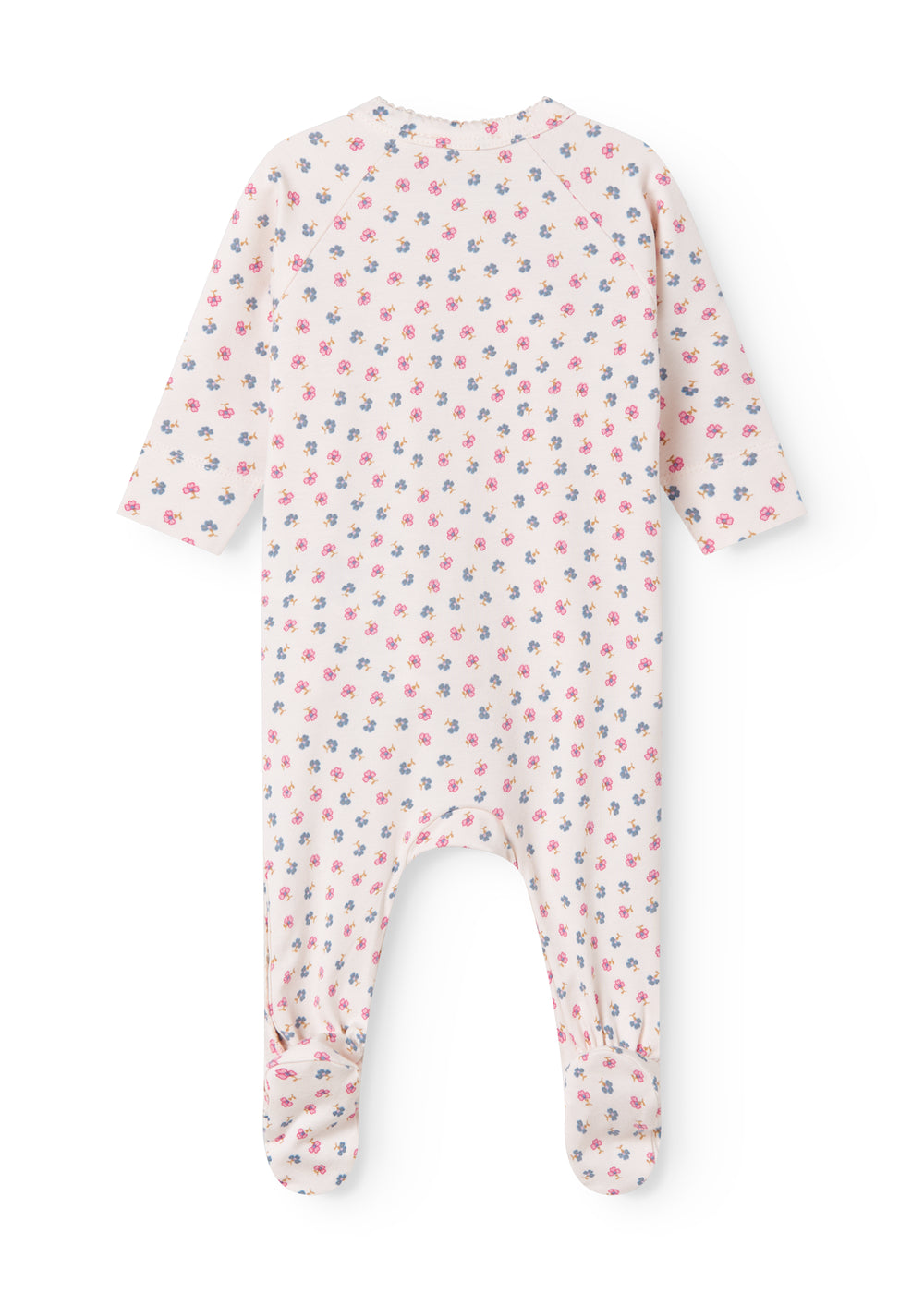 Langærmet heldragt med fødder til de mindste med et fint print og picotkanter. Heldragten har slå-om-lukning og lukkes med trykknapper og bindebånd fra halsen og ned langs det ene ben. Heldragten er både blød, strækbar og behagelig at have på.