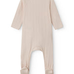 Langærmet pointelle heldragt med fødder til nyfødte. Heldragten har slå-om-lukning, picotkanter og lukkes med trykknapper og bindebånd fra halsen og ned langs det ene ben. Heldragten er blød, strækbar og behagelig at have på.