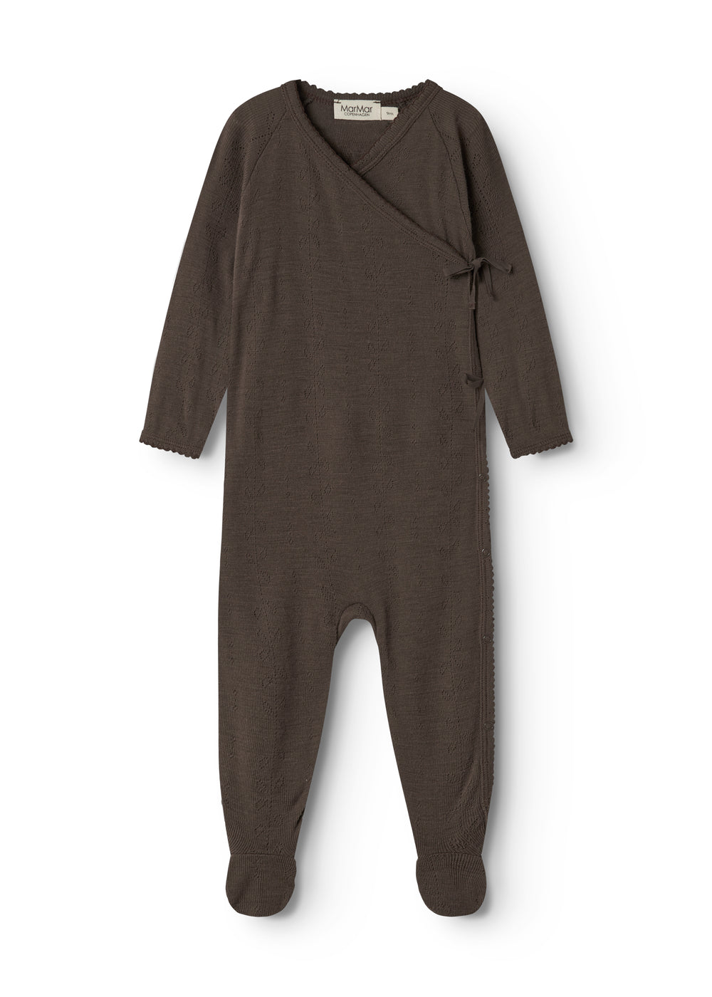 Langærmet heldragt med fødder til nyfødte. Heldragten har slå-om-lukning og lukkes med trykknapper og bindebånd