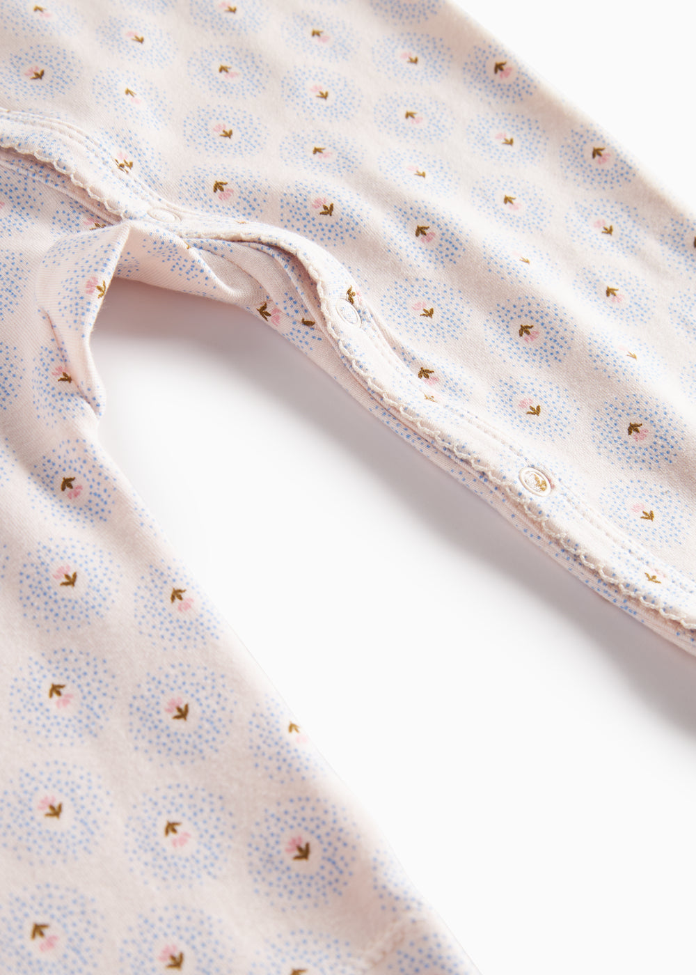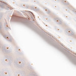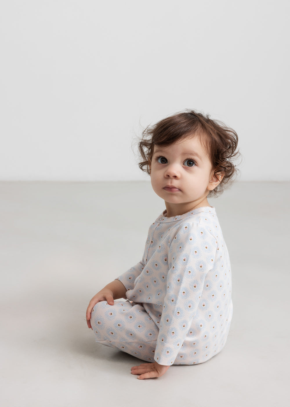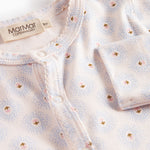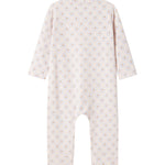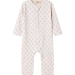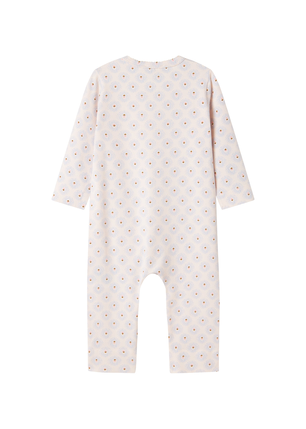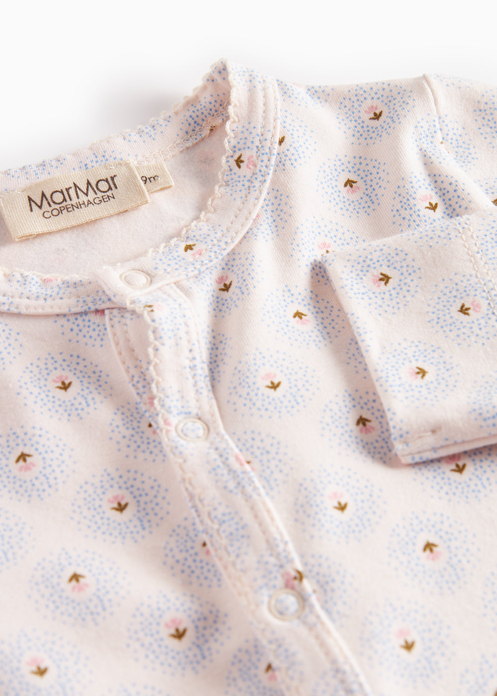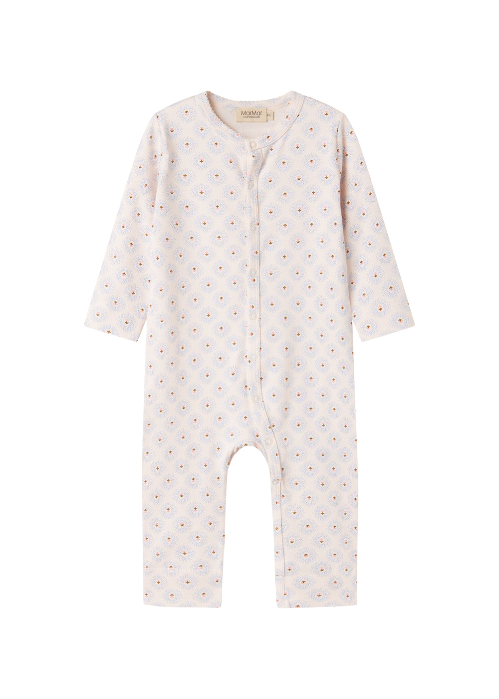 Rummelig baby heldragt med trykknaplukning hele vejen fra halsåbning til bukseben. Heldragten kan knappes helt op på det ene ben for nem bleskiftning. Heldragten har et fint print samt er både blød, strækbar og behagelig at have på.