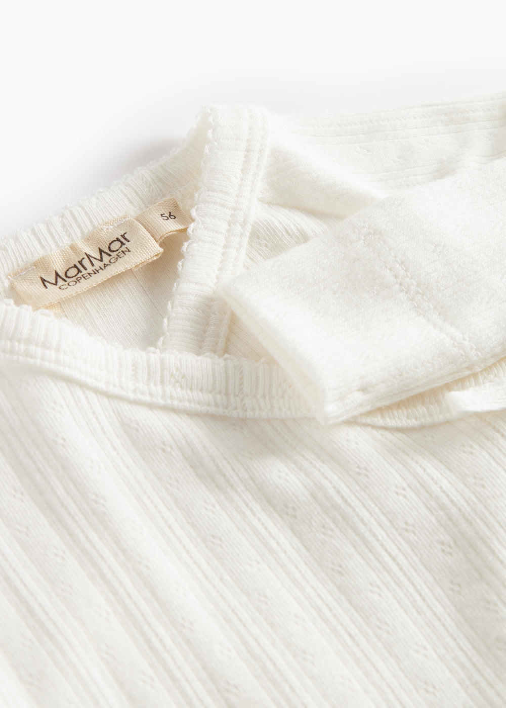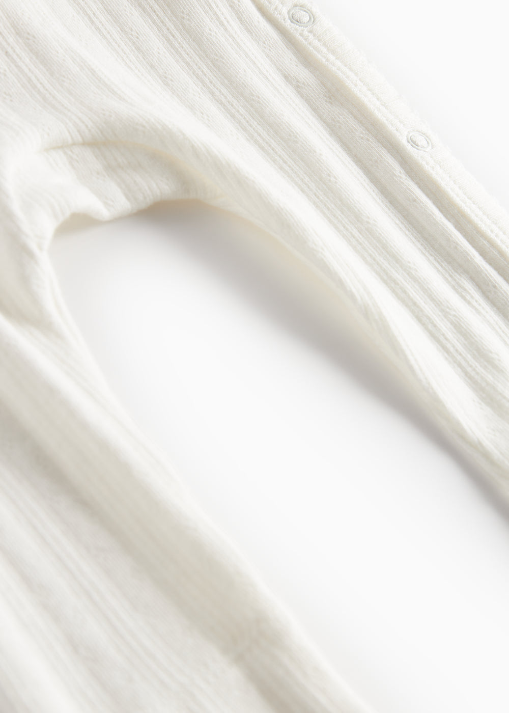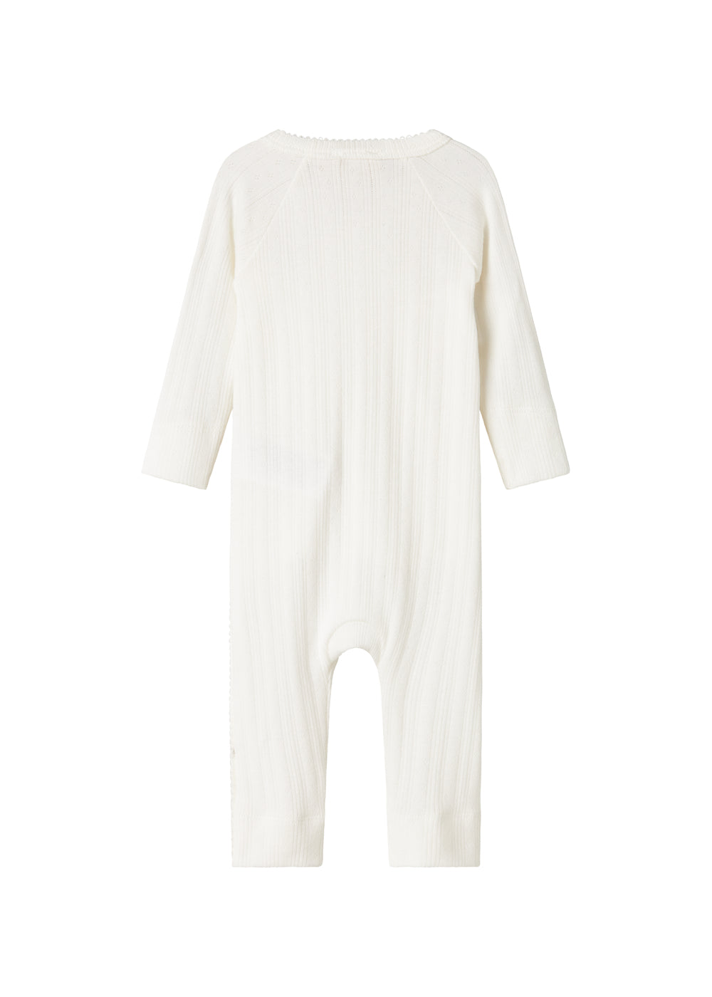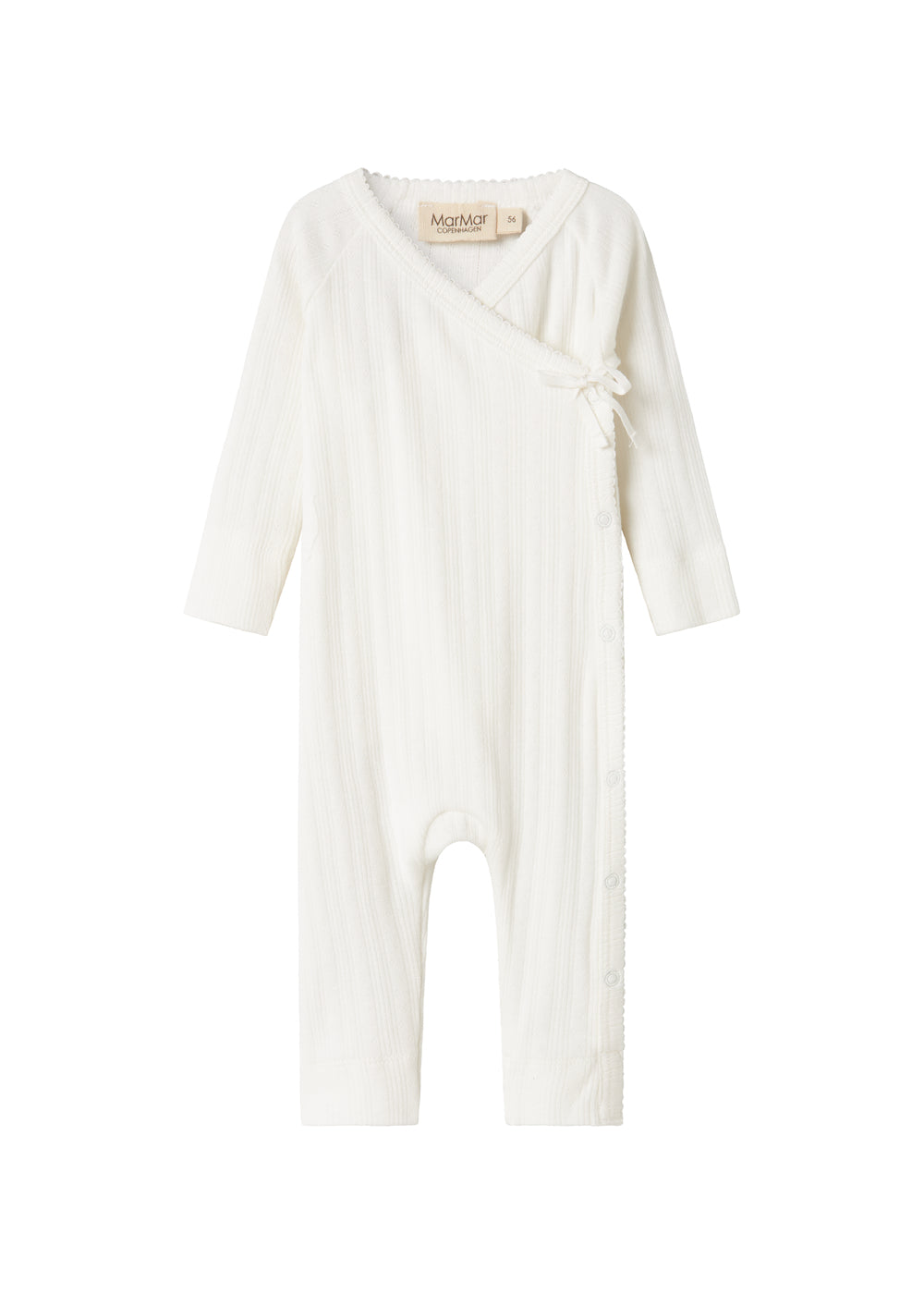Langærmet pointelle heldragt med slå-om-lukning til nyfødte. Heldragten har picotkanter og lukkes med trykknapper og bindebånd fra halsen og ned langs det ene ben. Heldragten er blød, strækbar og behagelig at have på.