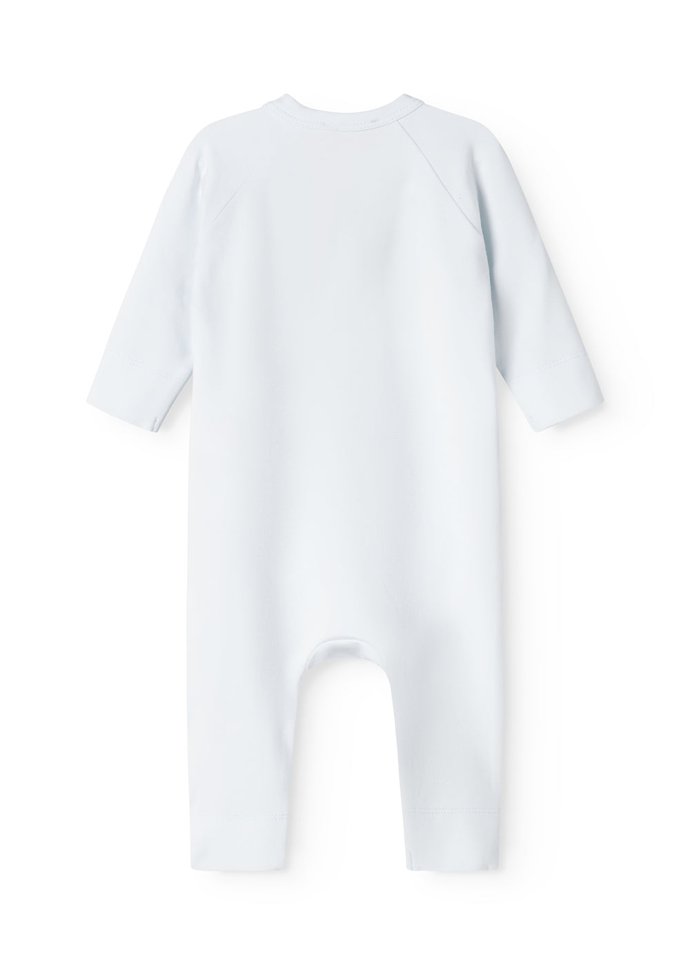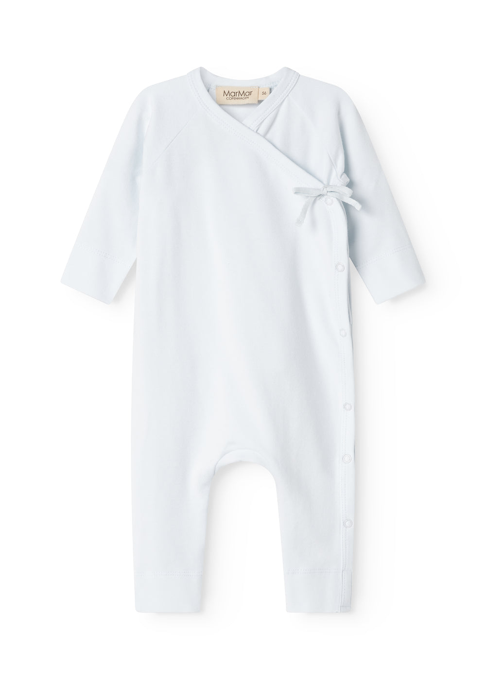 Langærmet heldragt med slå-om-lukning, heldragten lukkes med trykknapper og bindebånd fra halsen og ned langs det ene ben.