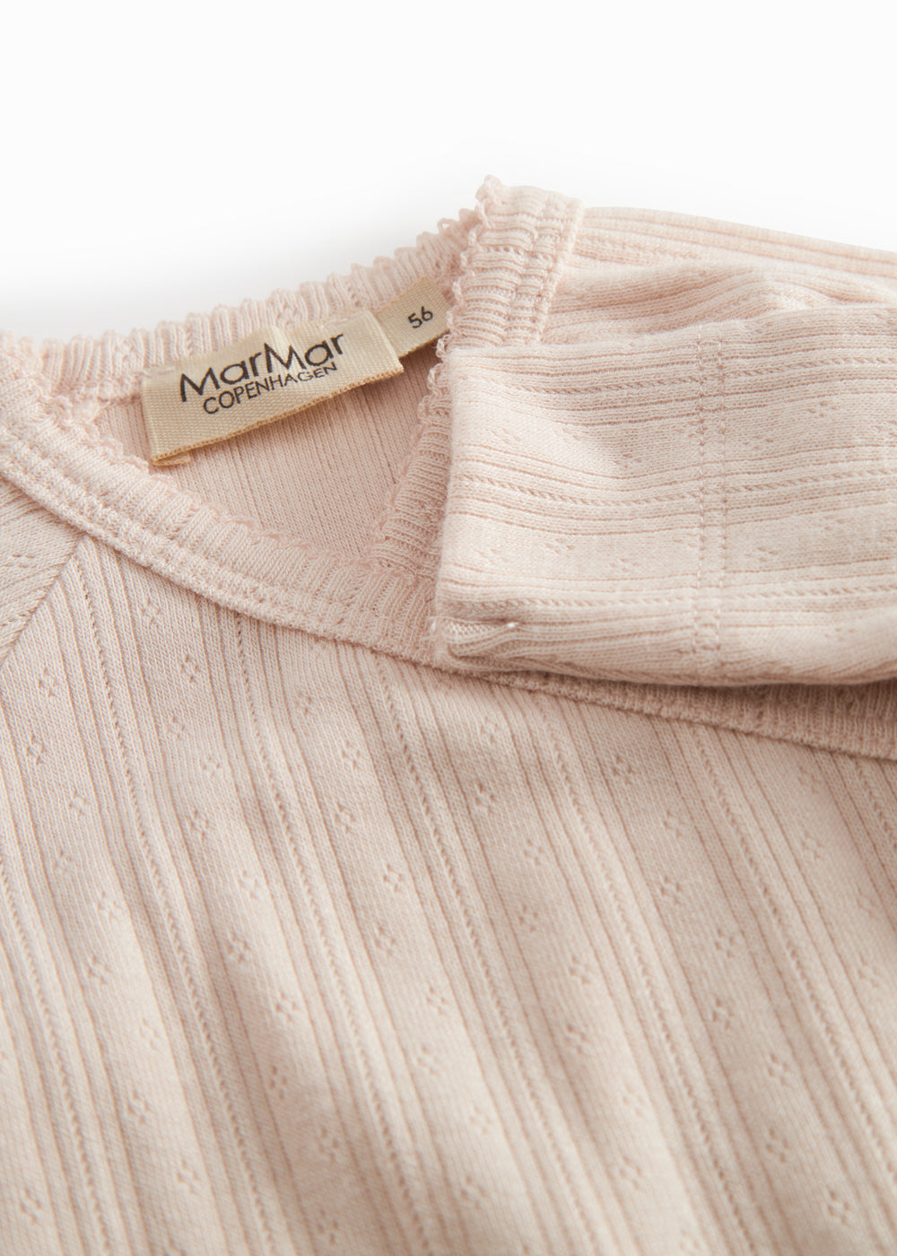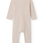 Langærmet pointelle heldragt med slå-om-lukning til nyfødte. Heldragten har picotkanter og lukkes med trykknapper og bindebånd fra halsen og ned langs det ene ben. Heldragten er blød, strækbar og behagelig at have på.