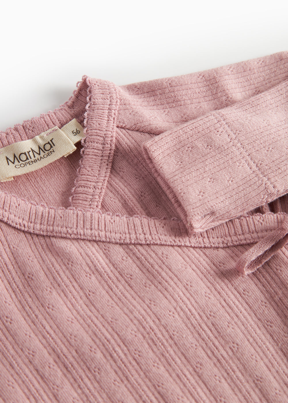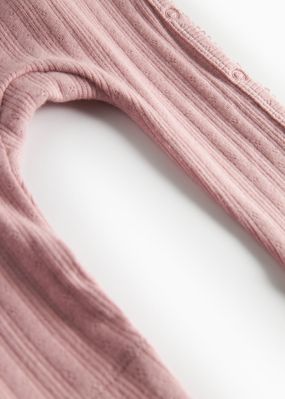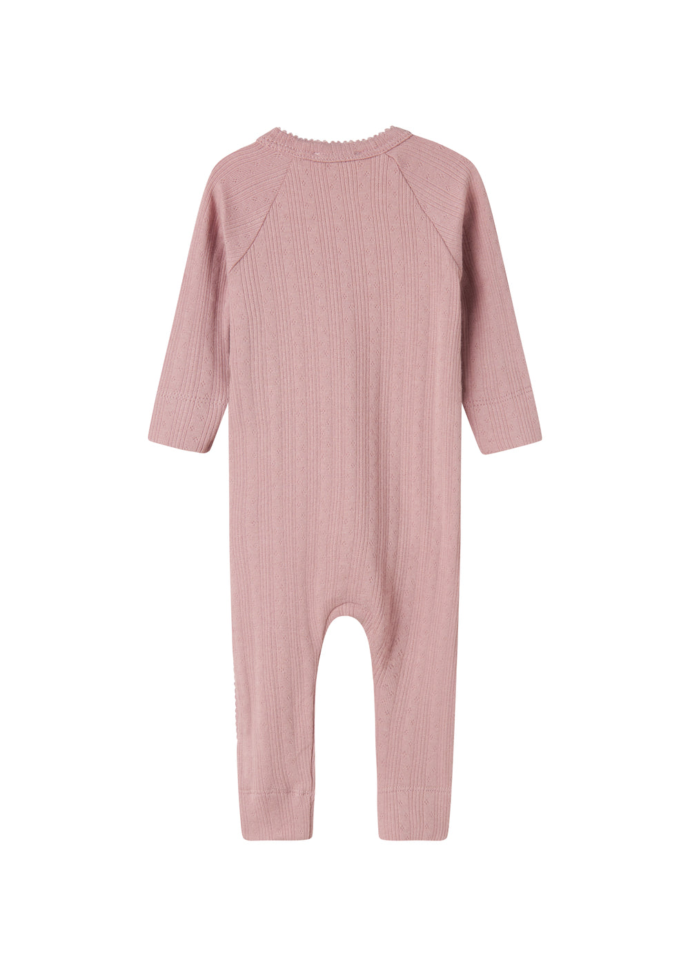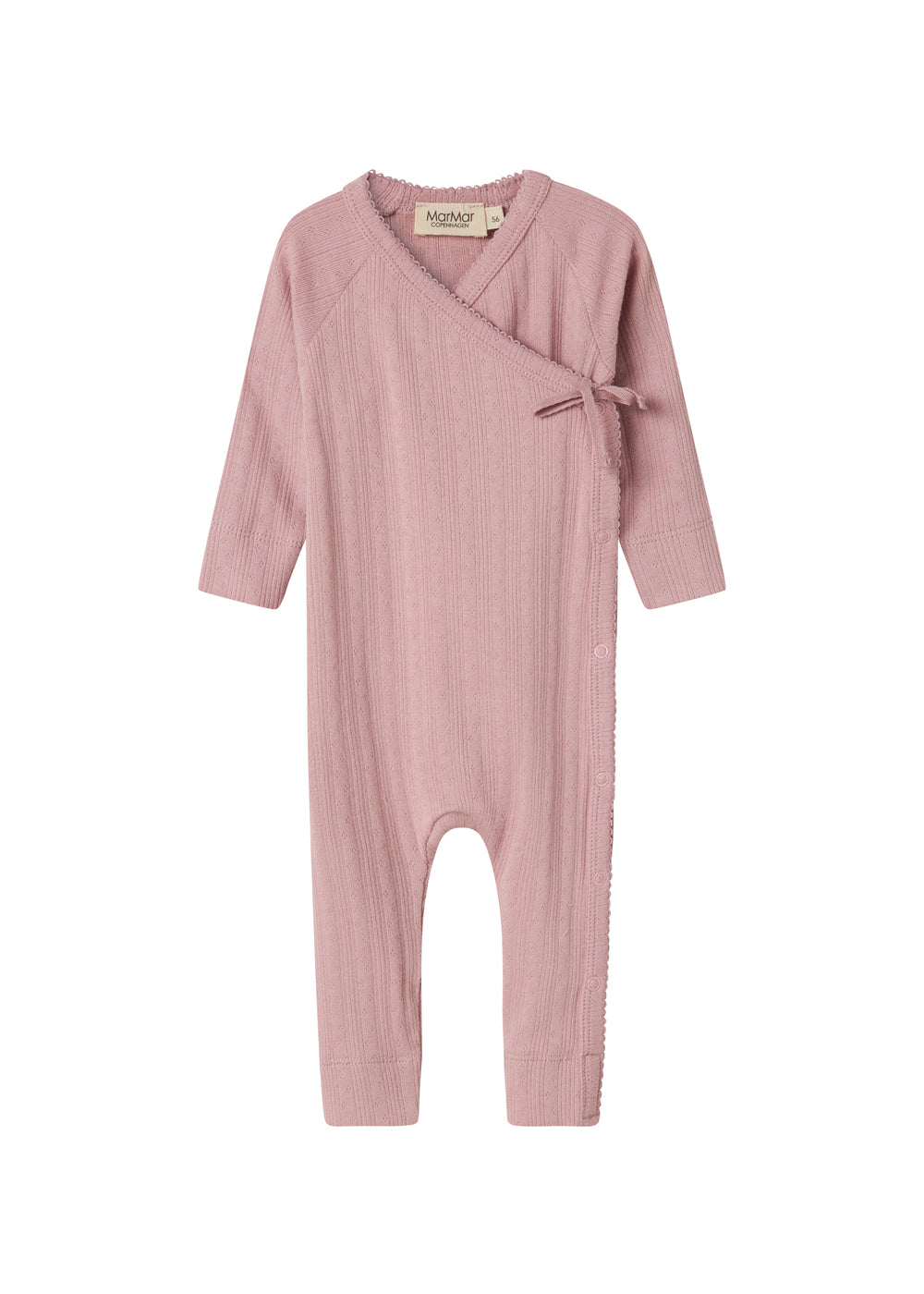 Langærmet pointelle heldragt med slå-om-lukning til nyfødte. Heldragten har picotkanter og lukkes med trykknapper og bindebånd fra halsen og ned langs det ene ben. Heldragten er blød, strækbar og behagelig at have på.