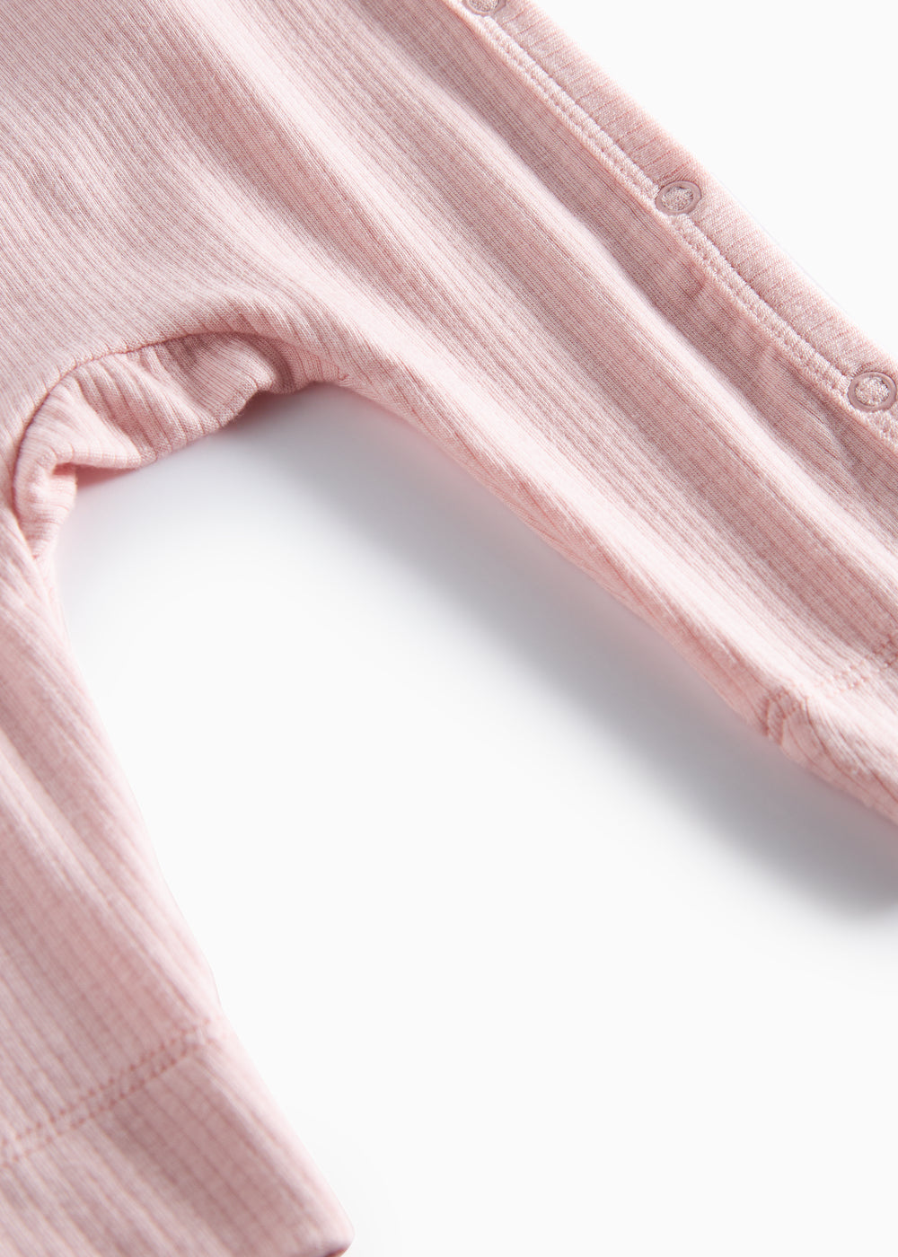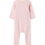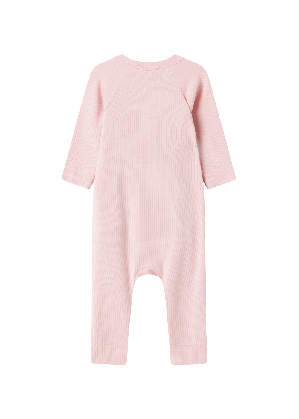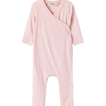 Langærmet heldragt med slå-om-lukning til nyfødte. Heldragten lukkes med trykknapper fra hals og ned langs det ene ben. Heldragten er utrolig blød, meget strækbar og behagelig at have på.