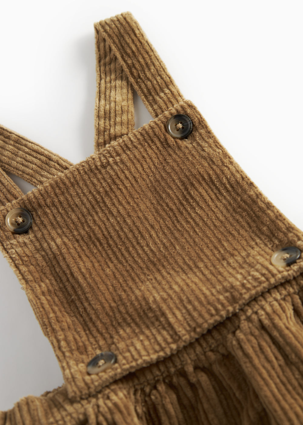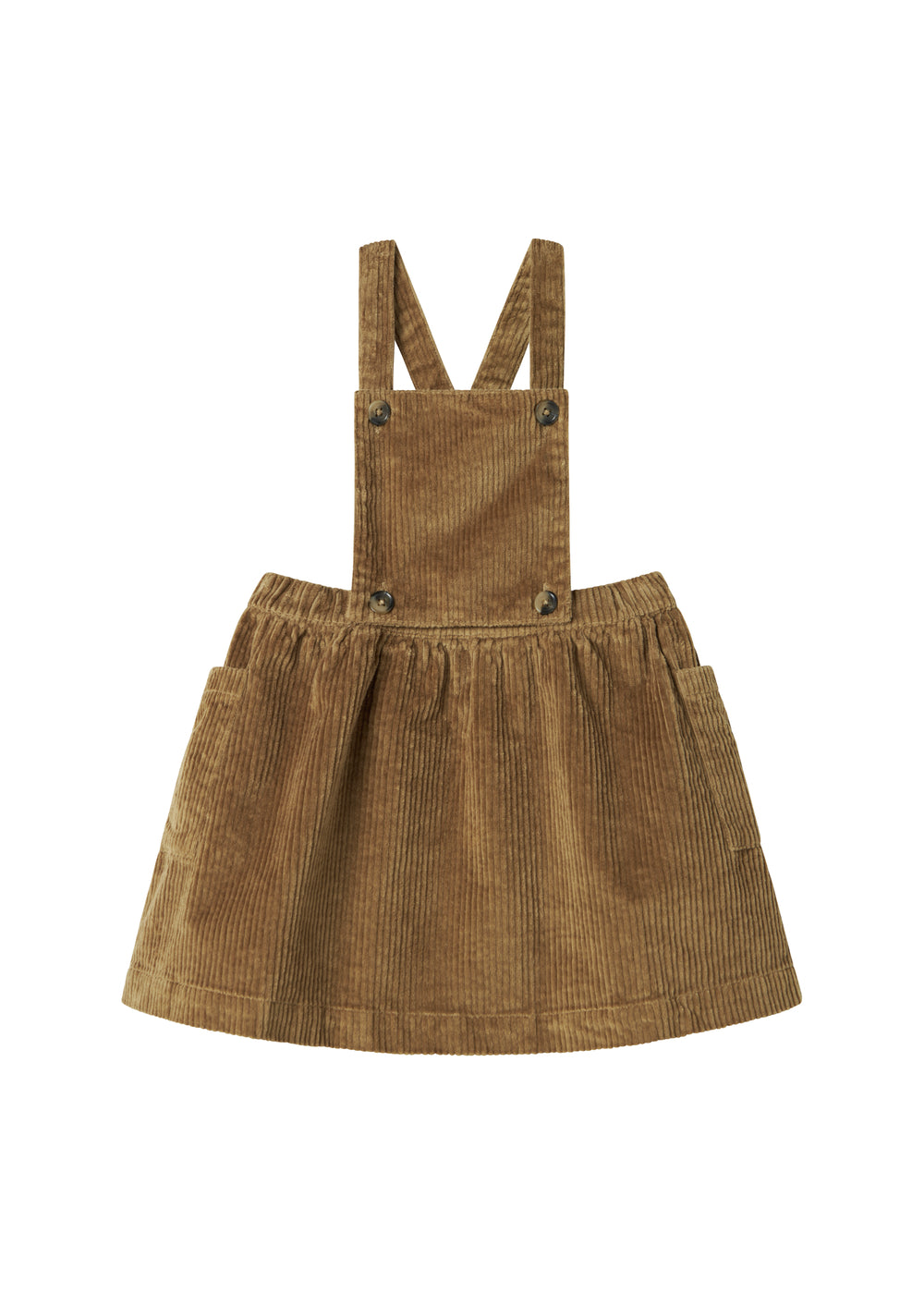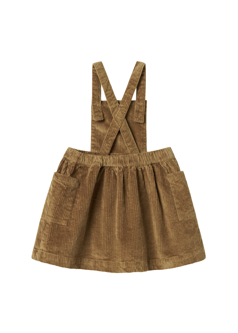 Fløjls nederdel med elastik i livet, lommer på siderne og med seler der knappes foran og krydser på ryggen. Kan bruges både med og uden selerne. Nederdelens længde går til over knæet.