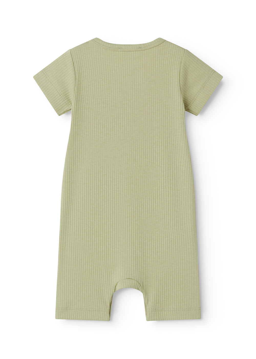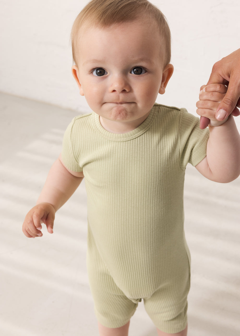 Kortærmet baby modal romper med korte ben, der bliver lukket med trykknapper mellem benene for nem bleskiftning. Romperen er ribstrikket, blød, holder form og farve og har elastan i sig som gør den strækbar og behagelig at have på.
