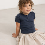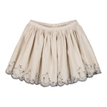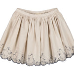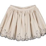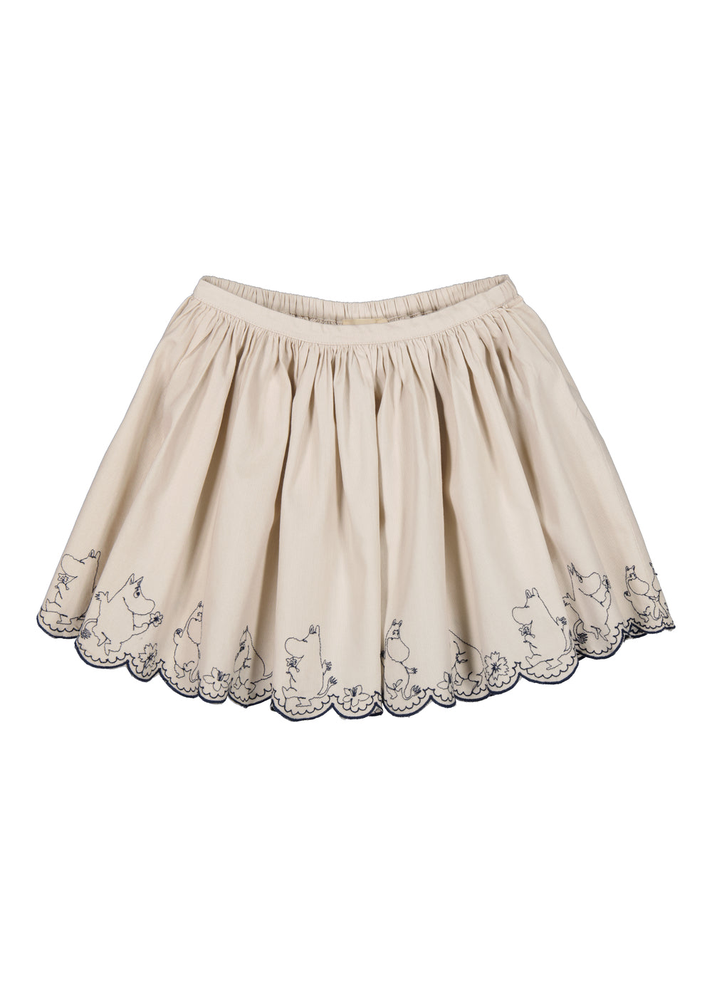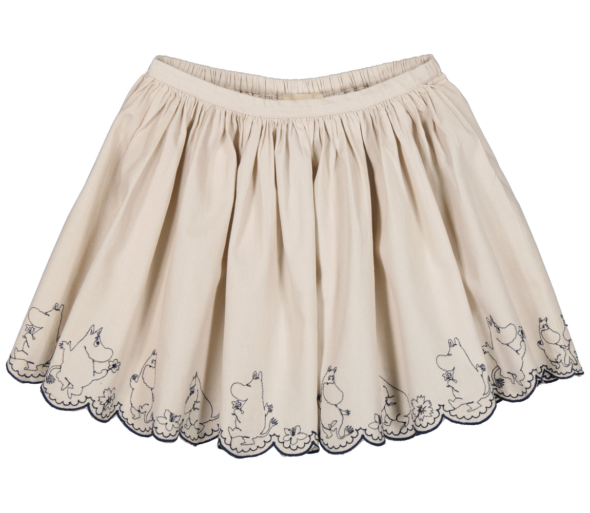 Nederdel med elastik i livet og fine bølgede kanter med broderede Moomin detaljer forneden. Nederdelens længde går til over knæet