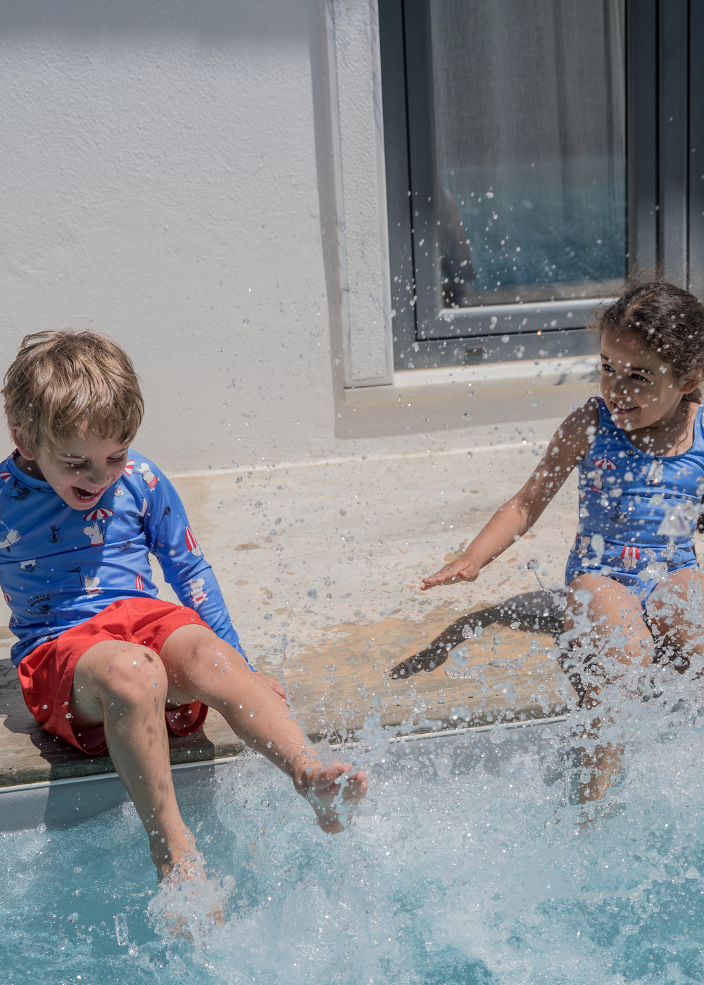 Badeshorts til børn med bred elastik i taljen, snørrelukning og inderbuks i blød og behagelig mesh. Badeshortsene er behagelige at have på.