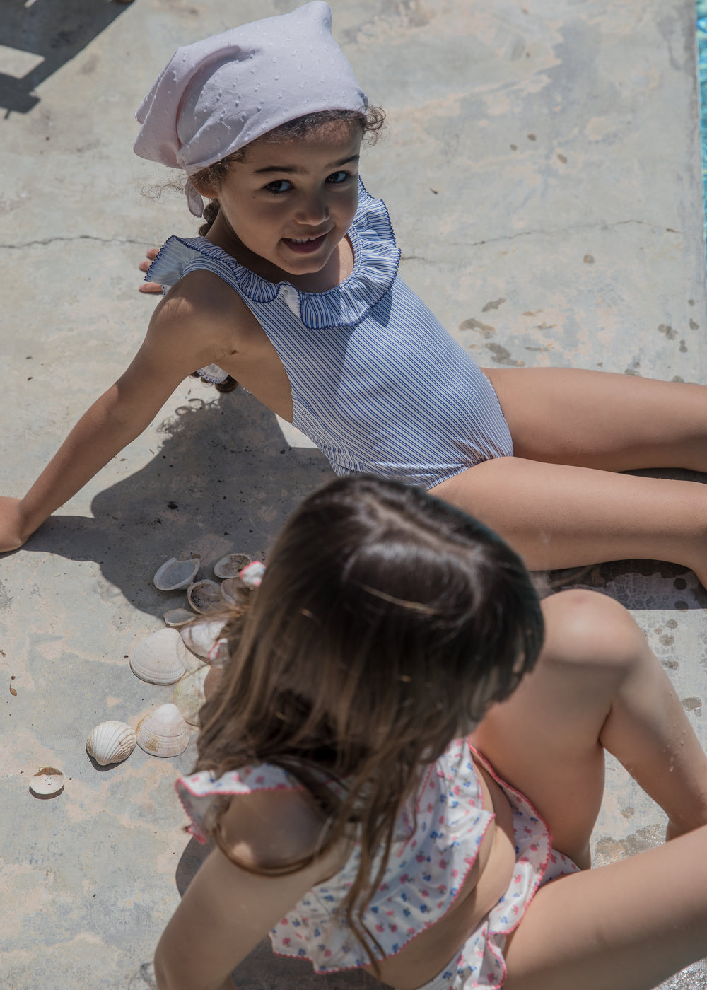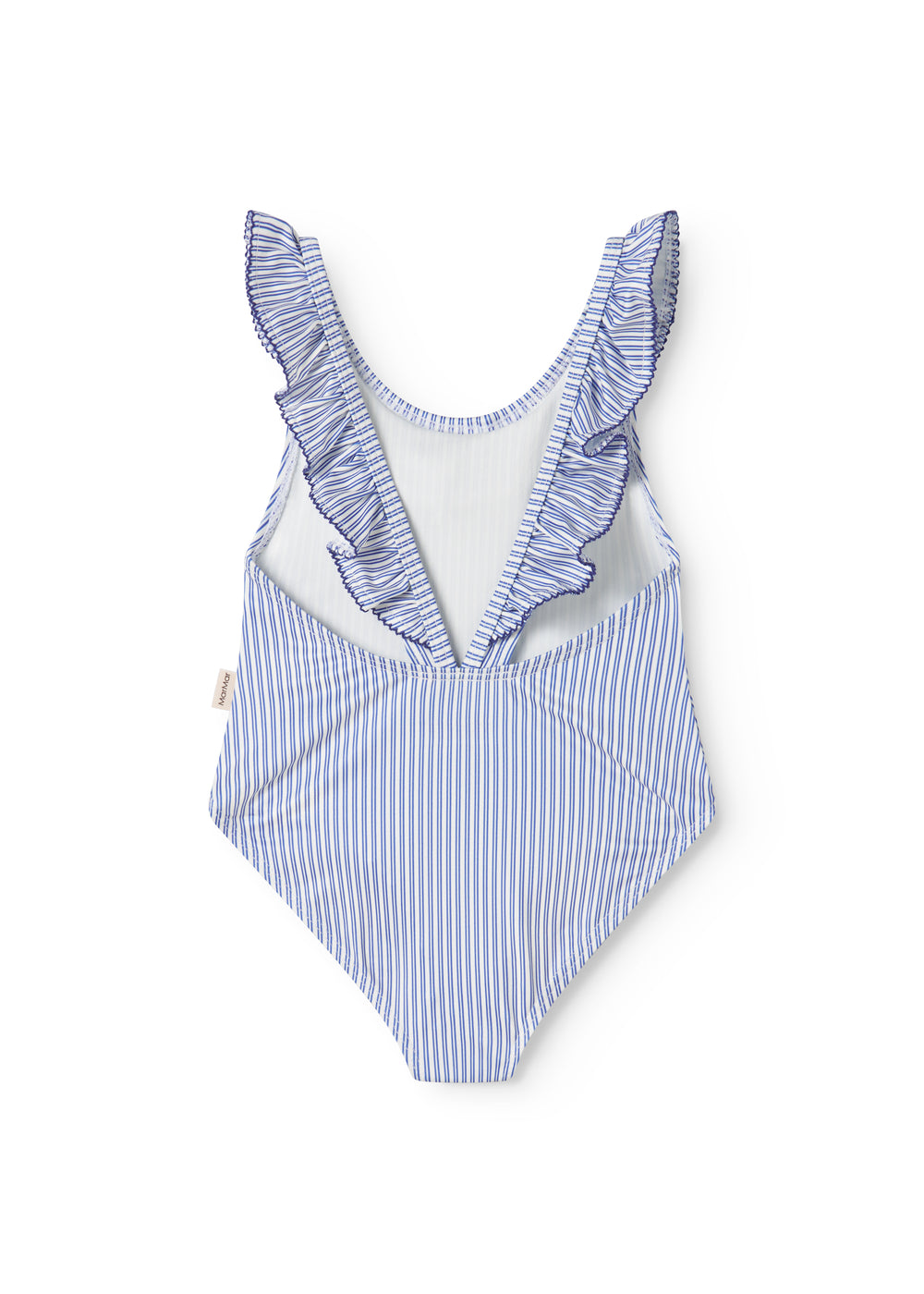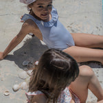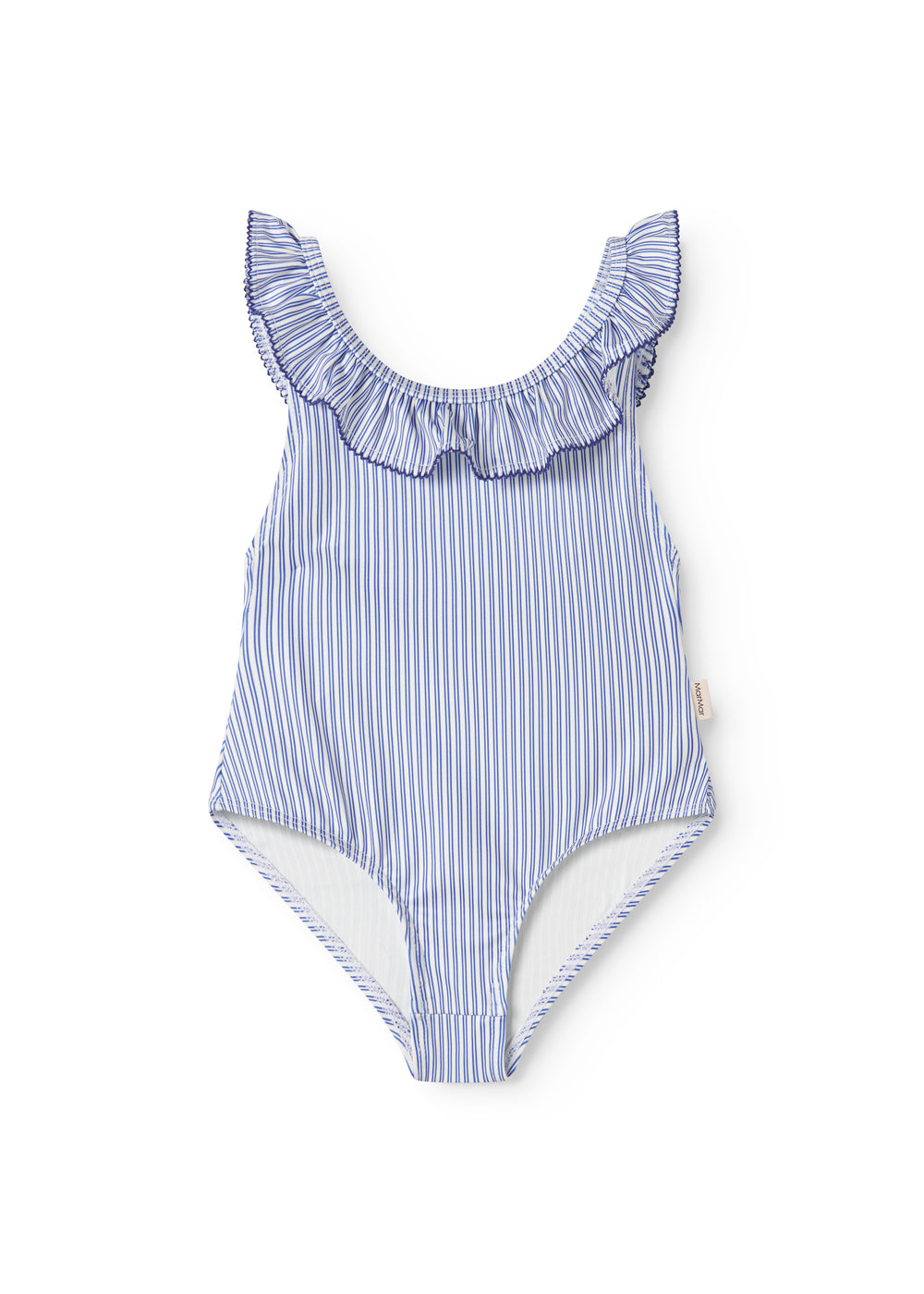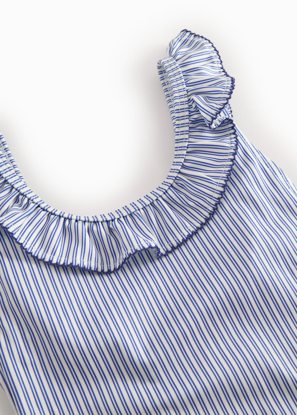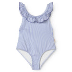 Badedragt til børn med krave og fine flæse detaljer og picotkanter. Badedragten har fine striber.