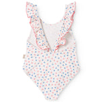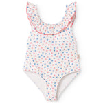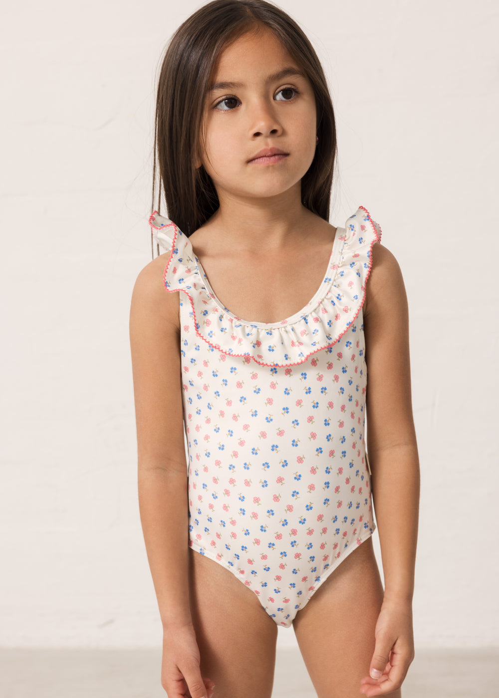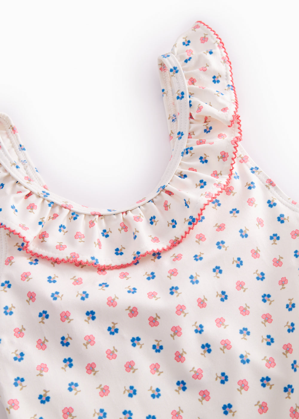 Badedragt til børn med krave og fine flæse detaljer og picotkanter. Badedragten har et fint blomster print.