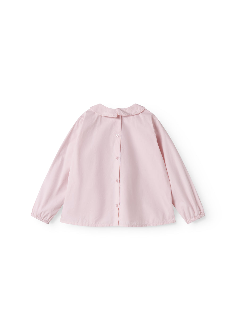 Langærmet og løstsiddende bluse til børn, med lille krave og knaplukning hele vejen ned bagpå. Blusen er i en let og crispy bomuldskvalitet, hvilket gør den behagelig at have på.