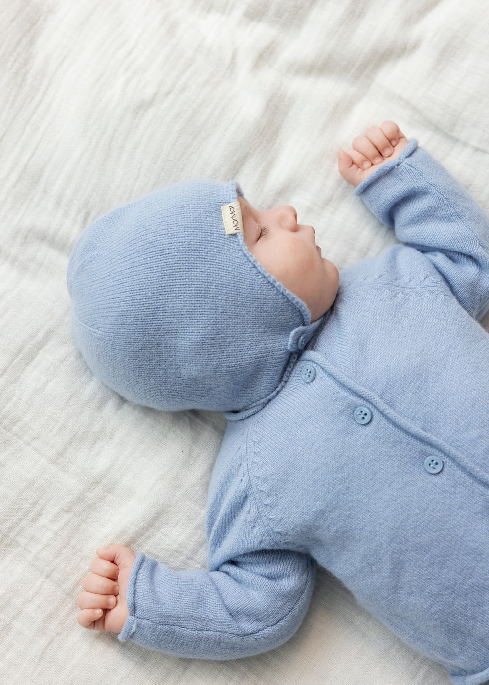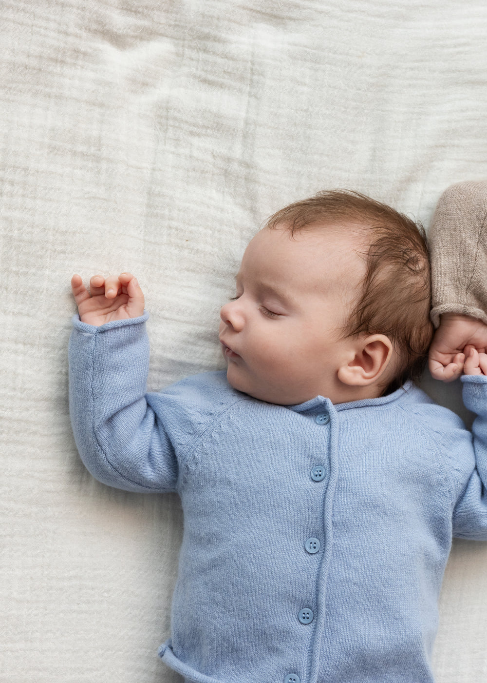 Kashmir cardigan til baby med knaplukning, rullekant og raglanærmer. Kashmir cardiganen er ultra blød, varm og behagelig at have på og helt perfekt til de koldere dage.