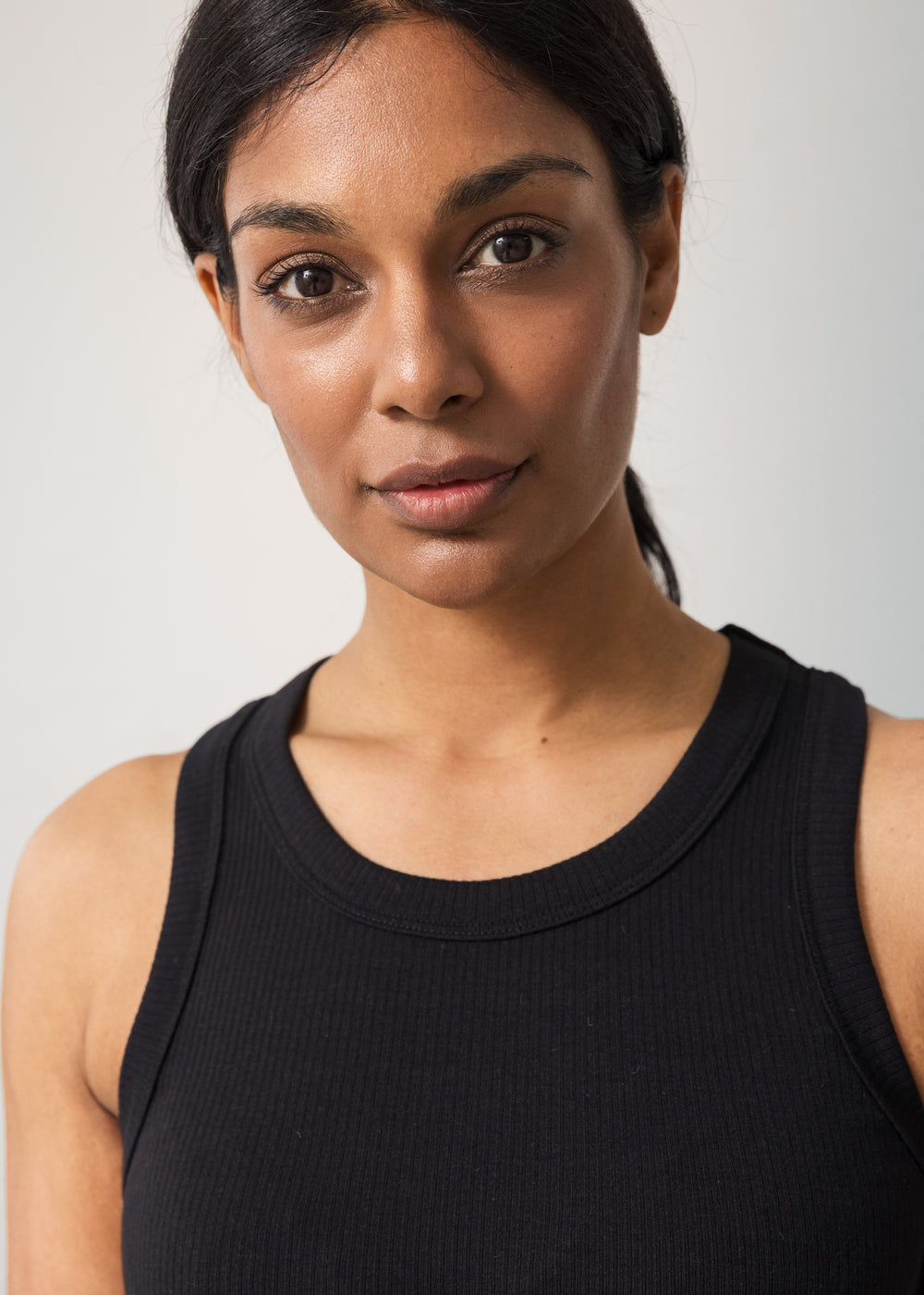 Ribbet tanktop til kvinder med rund hals og tætsiddende pasform. Toppen er både blød, strækbar og behagelig at have på.