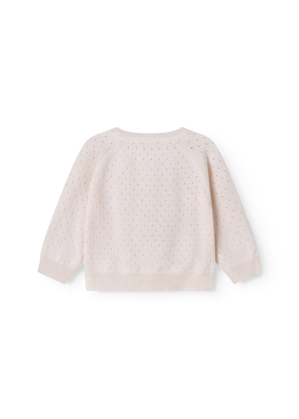 Strik cardigan til de mindste, med fint hulmønster og knaplukning. Cardiganen har rund hals, raglanærmer og ribkanter ved ærmer og bund.