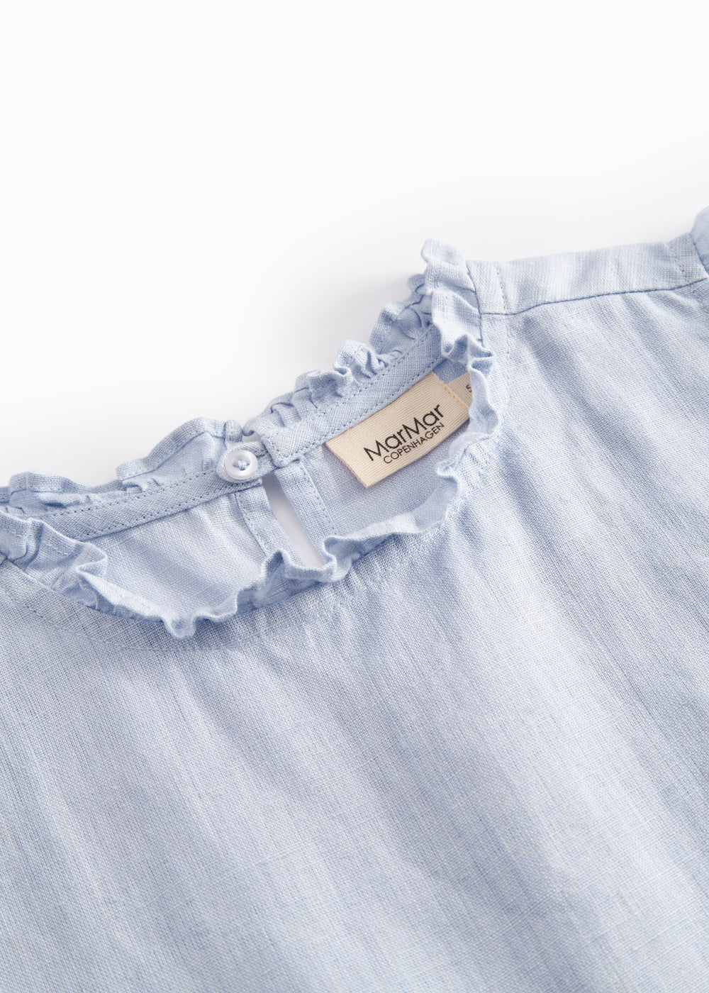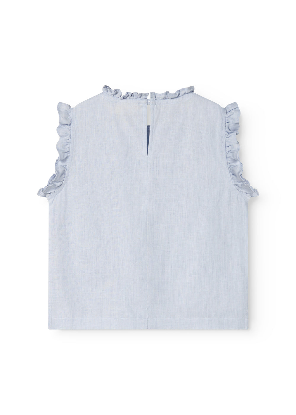 Ærmeløs top til børn i en luftig og behagelig hør kvalitet, med en løs pasform og bølgede flæsedetaljer. Toppen har knaplukning bagpå.