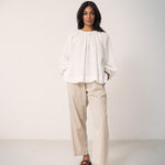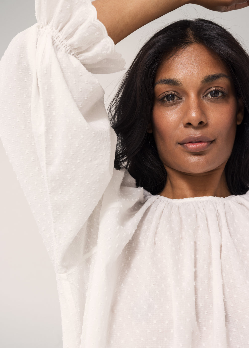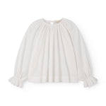 Langærmet og løstsiddende bluse til kvinder med broderimønster. Blusen lukkes med knaplukning og bindebånd bagpå og har elastik detalje ved håndleddet samt bølgede ærmedetaljer. Blusen er behagelig og luftig at have på.