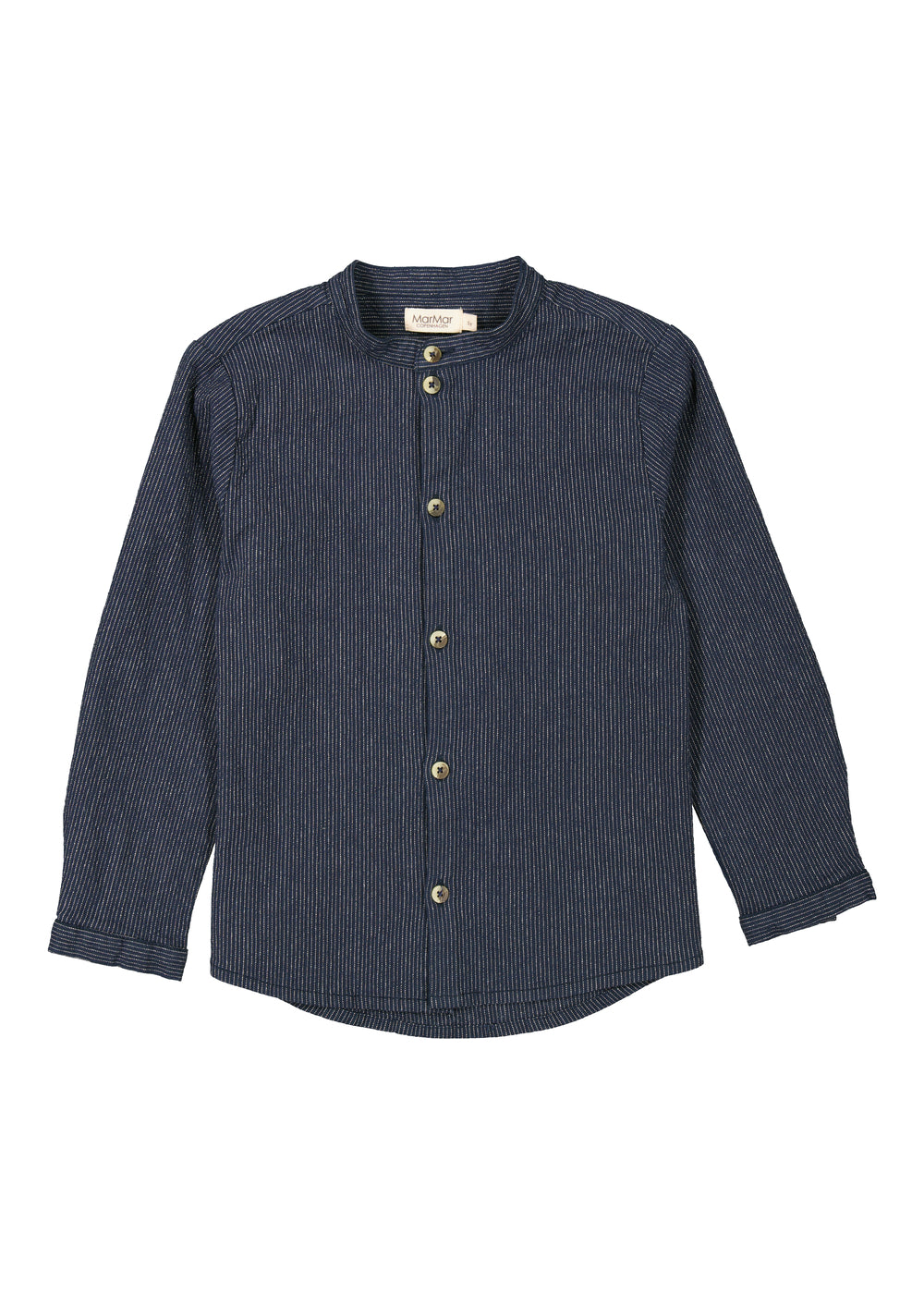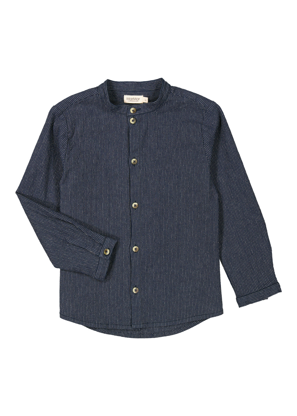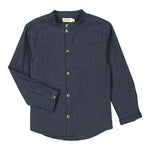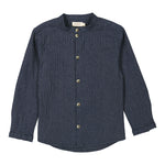 Langærmet stribet chambray denim skjorte med kinakrave og knaplukning