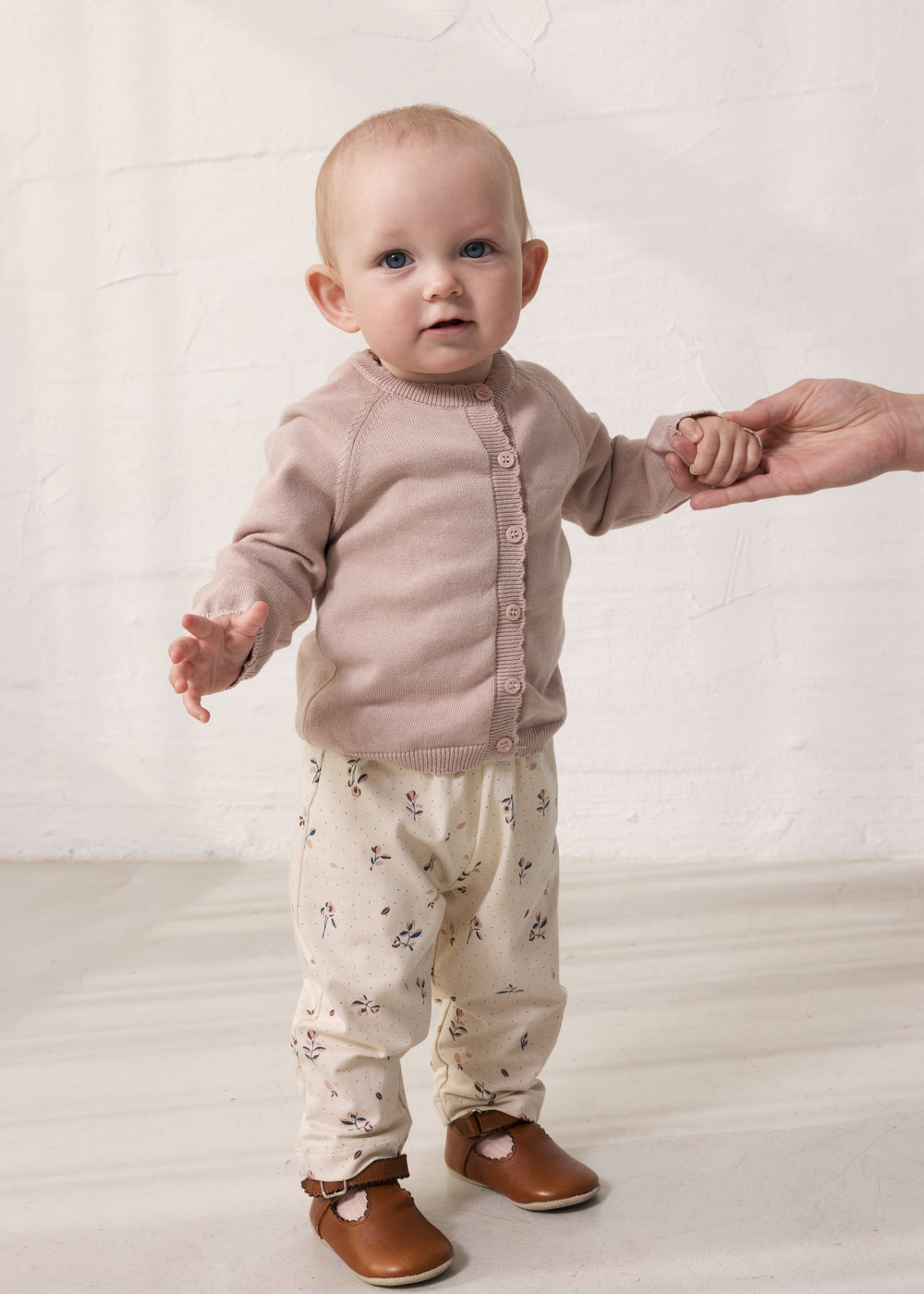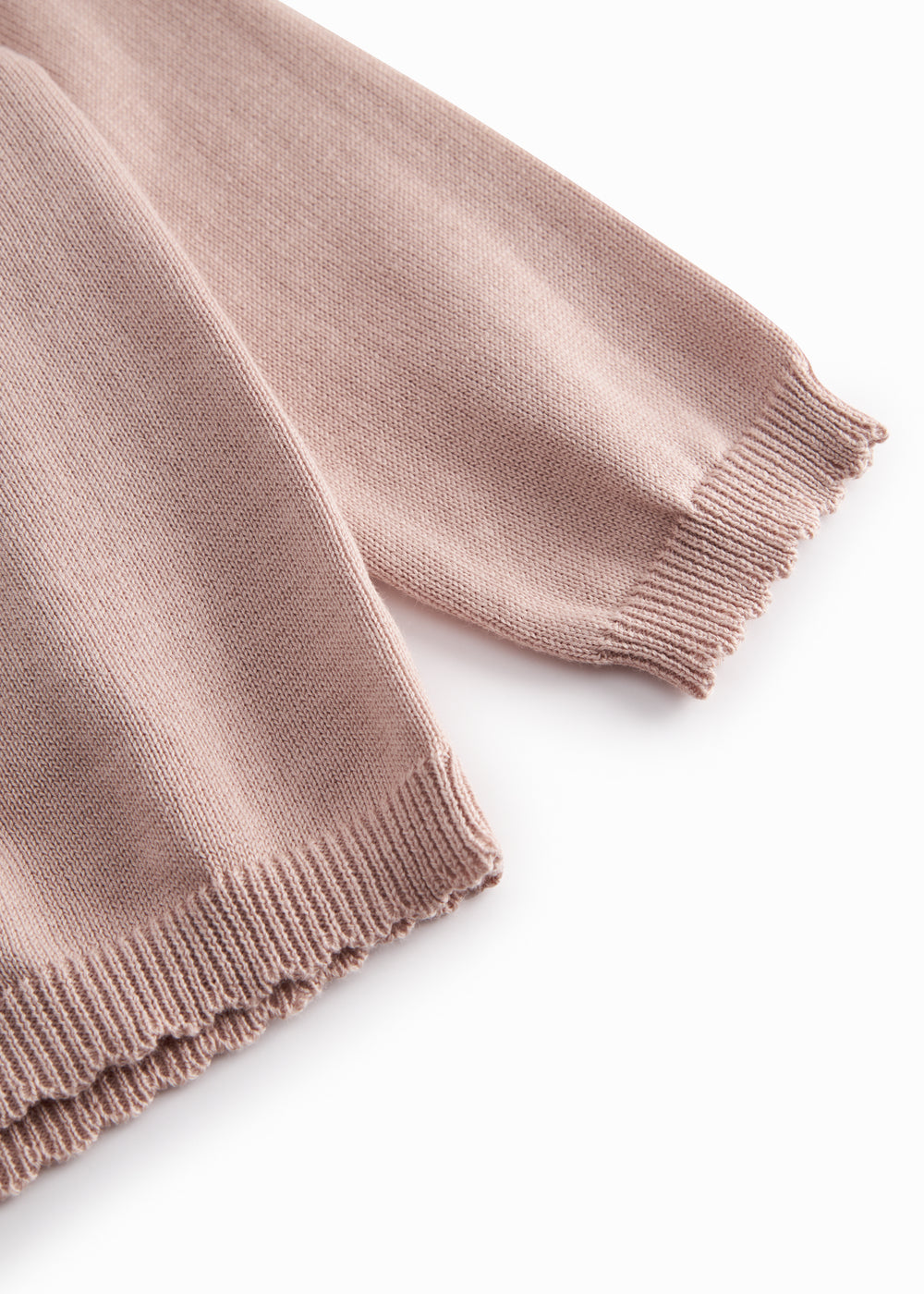 Strik cardigan til de mindste med raglanærmer, knaplukning foran og fine bølgede kanter. Cardiganen er glatstrikket og har ribkanter for et behageligt fit.