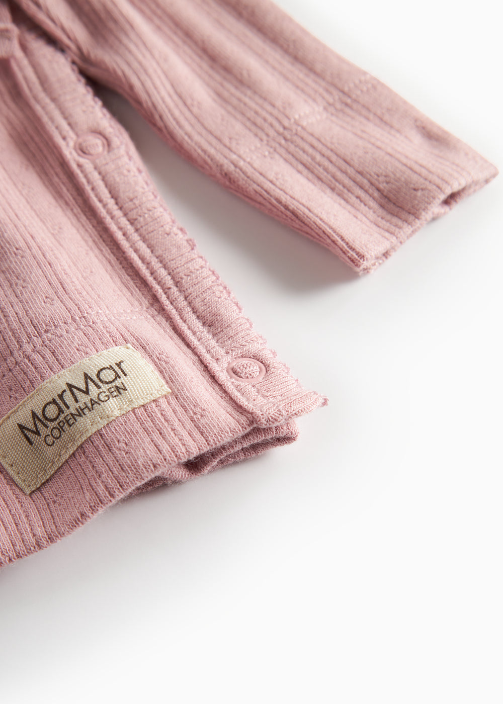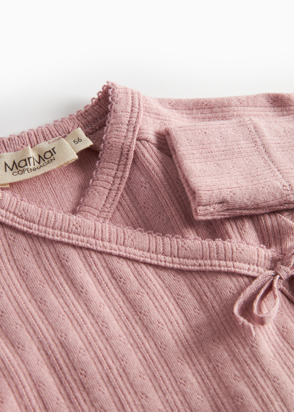 Langærmet pointelle bluse til nyfødte med slå-om-lukning og picotkanter. Blusen lukkes med trykknapper og bindebånd og er blød, strækbar og behagelig at have på.
