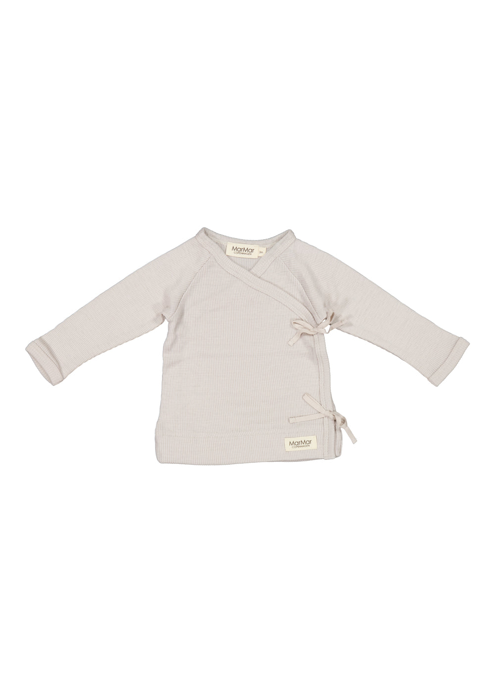 Langærmet bluse til nyfødte med slå-om-lukning. Lukkes med trykknapper og bindebånd.